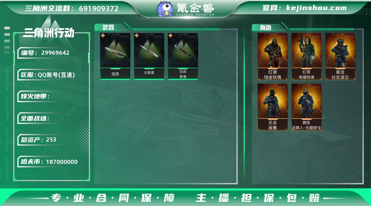 "yc8387/QQ区//253M总资产/187M哈夫币/特勤处9677/S6赛季3*3/【干员皮肤:红狼蚀金玫瑰/红狼-电锯惊魂/威龙-壮志凌云/无名-夜影/蜂医-送葬人/】/【刀皮:北极星/黑海/信条】/M4A1突击步枪-蚀金玫瑰/ASh-12战斗步枪-鹅鸭杀/K437突击步枪-北极星/KC17突击步枪-电锯惊魂/R93狙击步枪-维什戴尔/AWM狙击步枪-捞点薯条/ "