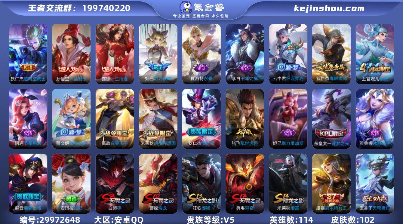 不玩了 支持包赔 英雄有114个 皮肤有102个 限定有一些