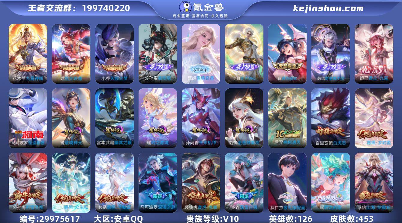 贵族等级:V10 典藏皮肤数:3 珍品无双皮肤数:0 无双皮肤数:6 珍品传说皮肤数:1 传说皮肤数:55 史诗皮肤数:145 皮肤数:453 英雄数:126 段位:无双王者 卖家说:有小万战镜和貂蝉金标和玄策鲁班大师银标和小部分射手打野铜标,卖了给男朋友买礼物,勿屠龙刀