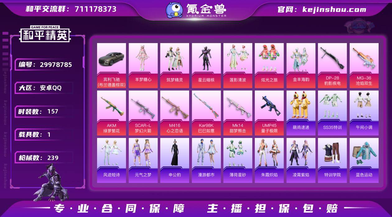 【ky596】苹果 手Q-9粉装-7特效枪-1载具-1粉色飞行器-86827热力值-16王牌印记-240套装-269枪皮 【热门品类】:粉装-缤纷油彩,套装-浪漫天命,套装-小丑鱼,套装-金羽特工,套装-龟仙人,套装-潮萌小黄鸭,套装-粉红小猪 【粉色套装】:粉装-天使彩虹糖,粉装-缤纷油彩,粉装-俏皮狐尾,粉装-星之彼岸,角色-洛天依,粉装-纯珍童话,角色-呆萌星弥,角色-小可学妹,角色-电磁星 【粉色枪皮等级】:AKM-炫紫旋律(七级),SCAR-L-青春物语(七级),M416-电玩时刻(五级),GROZA-巴啦啦小魔仙(七级),UMP45-萌骑冒险(二级),Kar98K-巳巳如意(五级),DP-28-豹影疾电(五级) 【粉色载具】:特斯拉Roadster(水滴蓝) 【粉色枪皮】:AKM-炫紫旋律,SCAR-L-青春物语,M416-电玩时刻,GROZA-巴啦啦小魔仙,UMP45-萌骑冒险,Kar98K-巳巳如意,DP-28-豹影疾电 【粉色飞行器】:阿狸红飞行器 【粉色降落伞】:粉色回忆降落伞,甜心宝贝降落伞,华贵君王降落伞,神秘黑猫降落伞,阿狸红降落伞,暗夜玫瑰降落伞,仲夏莫吉托降落伞,白勺歌姬降落伞,江南烟雨降落伞,忍者神龟降落伞,虹云熊熊降落伞 【稀有套装】:套装-龟仙人,套装-雪国风尚,套装-糖糖葫芦,套装-青团波波,角色-临安公主,套装-燕燕于飞,套装-鱼渊荷华,套装-旋风灵鼠 【稀有枪皮】:AKM-夜灯,AKM-彩虹符号,AKM-恐龙拽拽,AKM-灼热熔岩,AKM-萌趣颜团子,AKM-阿狸红,AKM-霓虹街区,M16A4-夜灯,M16A4-幻世战舞者,M16A4-甜心亚梦,M16A4-生命誓言,M16A4-红色方程式,M16A4-蓝色火焰,SCAR-L-炫彩节奏,SCAR-L-玉兔迎春,SCAR-L-红色方程式,SCAR-L-金风玉露,M416-夜灯,M416-神秘黑猫,M416-糯团青竹,M416-红色方程式,M416-绯红前夜,M416-蓝色火焰,M416-魔法学院,GROZA-彩虹符号,GROZA-影袭,GROZA-懵萌河马,GROZA-治愈之星,GROZA-田园牧歌,GROZ...