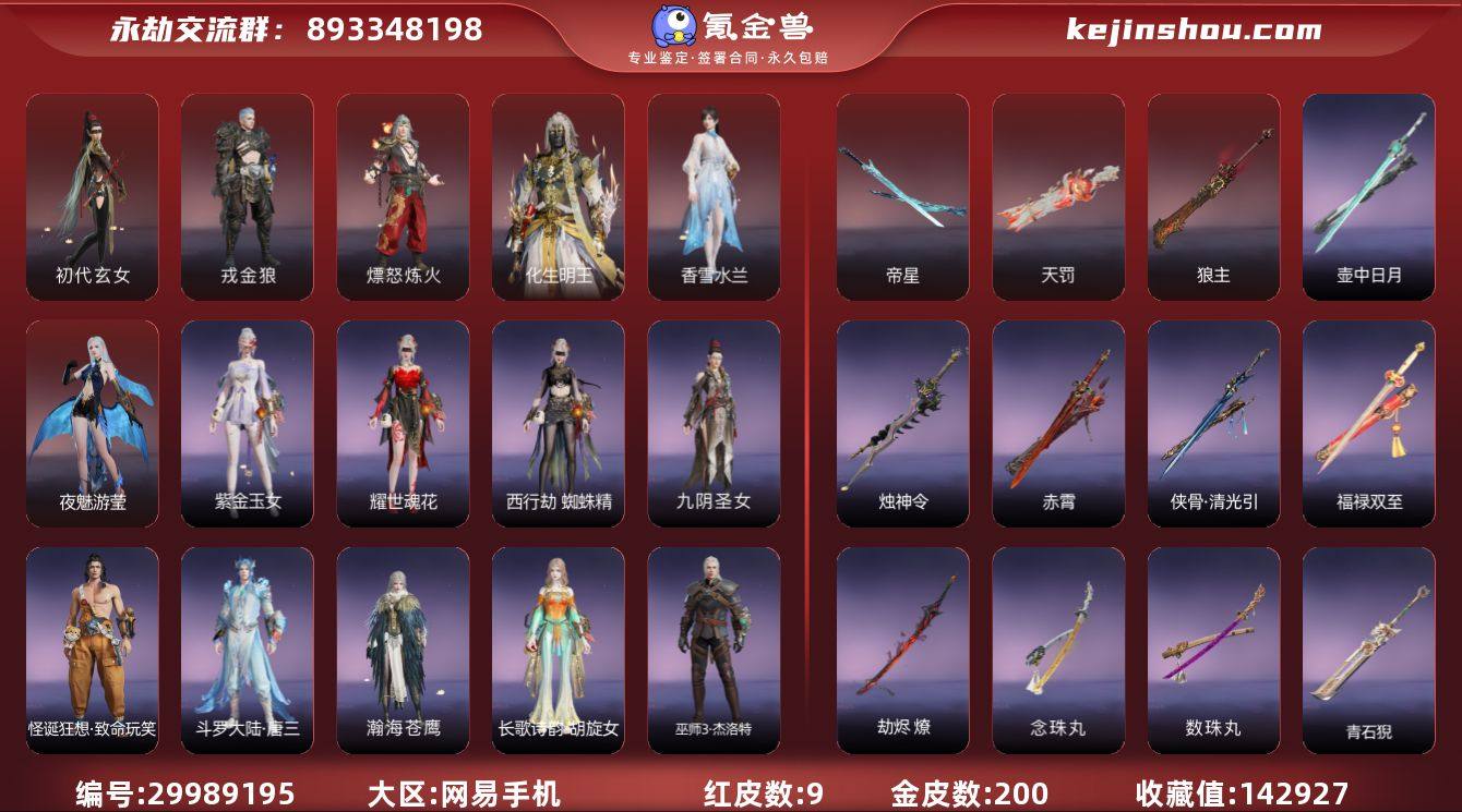 53金武器(连弩:咕咕、镇海、鸟铳:戏祥云、玉飞梭、金蝎、火炮:钻山、竹霹雳、貔貅吞宝、龙息、五眼铳:丹鹤、迎宵、鹦鹉螺、弓箭:月虹弦角、乌木弓、青花、猩红之月、暝蛇引、拳刃:无相印、长剑:侠骨•清光引、赤霄、烛神令、福禄双至、壶中日月、太刀:念珠丸、劫尽•燎、数珠丸、阔刀:青石猊、龙蟠、山君怒、听涛、幕影、枪:零木角、银镰枪、长虹、建木、委蛇矛、棍:学宫之杖、戒律杖、匕首:桡尺刀、仙舞、华夏神兵•马首刀、扇:青峰叠扇、耀夜流华、双节棍:咯咯、夔牛槌、嘶风、除岁、镇魔杵、九霄寒、精武、双刀:古墓丽影•登山镐、无救、天威、祸忌、破重云、双戟:衔月、)3红武器(火炮天罚、横刀帝星、阔刀狼主、)飞索(飞鼠)动作(丝滑连招•科目三)战利标记(金:闹新春、小青灯、联动紫:卧龙•一败涂地、白菜狗、) 宁红夜:挑染:云霞(金)皮肤:初代玄女(红)耀世魂花(金)西行劫•蜘蛛精(金)紫金玉女(金)九阴圣女(金) 沈妙:絮云衣(金) 天海:化生明王(红)若水尊者(金) 殷紫萍:挑染:白芷(金)苏木(金)皮肤:智绘·萍之缘(金) 岳山:开辟鸿蒙•金戈止(金)弘毅袍(金)华夏宝甲•汉光(金) 季沧海:熛怒炼火(红)巫师3•杰洛特(金) 胡桃:御宅罗梦(金)清雅少女(金) 妖刀姬:无 崔三娘:无 特尔木:戎金狼(红)怪诞狂想•致命玩笑(金)斗罗大陆•唐三(金) 无尘:挑染:羽客(金)皮肤:幽篁山鬼(金)灵鹿巫者(金) 顾清寒:香雪水兰(红)2674•霜凝雪(金)夏日派对•仲夏霜华(金) 武田信忠:挑染:忠嘉(金)皮肤:麟鹿大铠(金) 迦南:皮肤:长歌诗韵•胡旋女(金)语音包:胡旋女(金) 胡为:葫芦兄弟•蛤蟆头领(金) 季莹莹:夜魅游莹(红) 玉玲珑:无 哈迪:无 魏轻:无 刘炼:无 张起灵:无 席拉:无 蓝梦:无 万钧:无 李寻欢:无