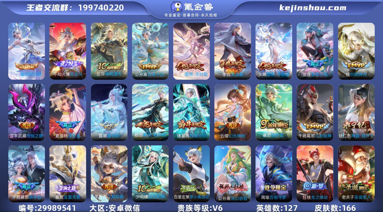 贵族等级:V6 典藏皮肤数:1 珍品无双皮肤数:0 无双皮肤数:1 珍品传说皮肤数:0 传说皮肤数:19 史诗皮肤数:42 皮肤数:166 英雄数:127 段位:非凡王者