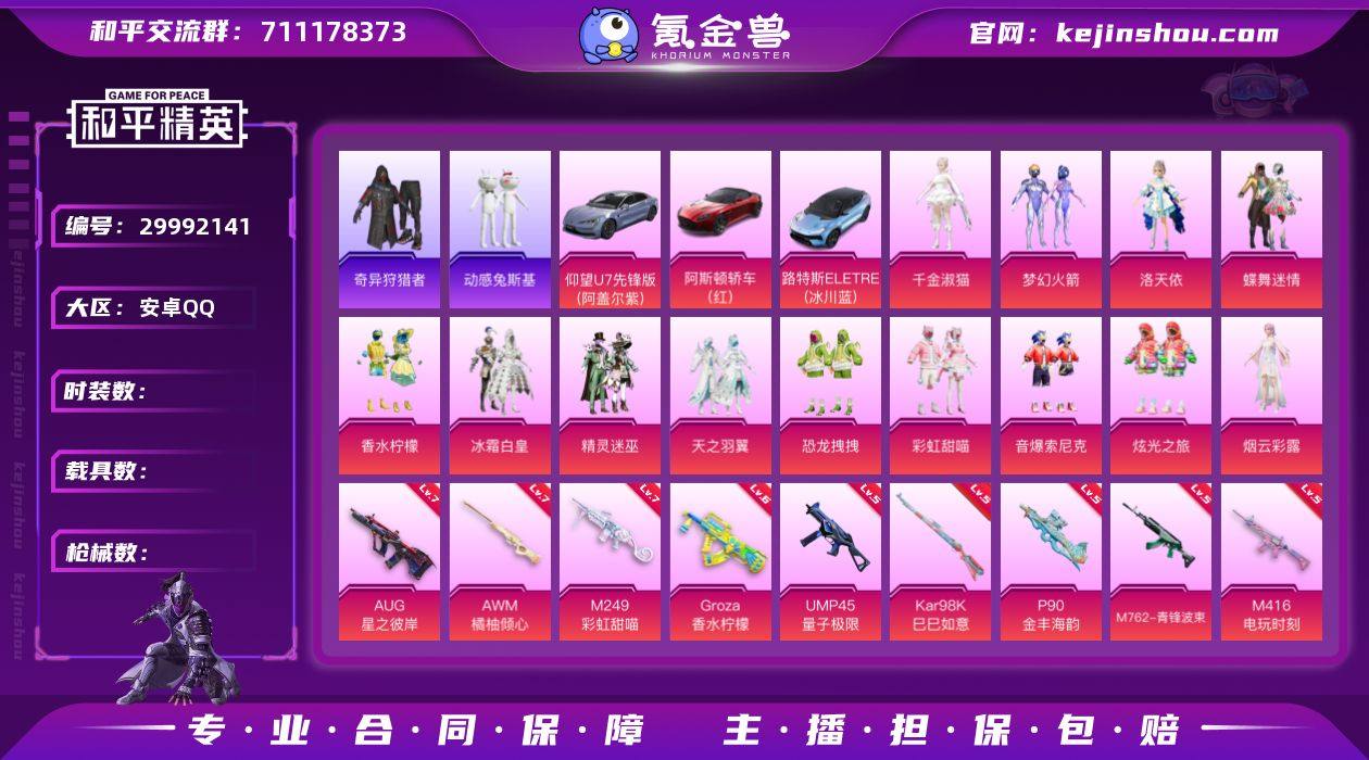 【ky255】安卓 手Q-7粉装-8特效枪-5载具-6粉色飞行器-87793热力值-18王牌印记-172套装-260枪皮 【热门品类】:套装-小丑鱼,角色-军刀雅典娜,角色-2P战斗服款,套装-龟仙人,角色-8号机,角色-Mark.06 【粉色套装】:粉装-新星烈龙,粉装-未来歌姬,角色-蔷薇星,粉装-暖暖奶龙,角色-千金淑猫,角色-冷漠罗丽,角色-霁蓝缠春 【粉色枪皮等级】:SCAR-L-青春物语(三级),M416-心之恋语(七级),GROZA-旋转彩虹(七级),AUG-暖羊咩咩(五级),M762-鬼刀(六级),蜜獾-异瞳寒姬(三级),Kar98K-巳巳如意(五级),DP-28-豹影疾电(五级) 【粉色载具】:玛莎拉蒂Quattroporte(夜幕蓝),宾利BATUR(极速紫),宾利添越(浅瞪羚棕),鬼马风驰,晶梦灵驹 【粉色枪皮】:SCAR-L-青春物语,M416-心之恋语,GROZA-旋转彩虹,AUG-暖羊咩咩,M762-鬼刀,蜜獾-异瞳寒姬,Kar98K-巳巳如意,DP-28-豹影疾电 【粉色飞行器】:炫彩糖果飞行器,祥瑞起舞飞行器,天之羽翼飞行器,歌者泠鸢飞行器,幽焰列车飞行器 【粉色降落伞】:绝对恒星降落伞,春暖花开降落伞,星之彼岸降落伞,天之羽翼降落伞,碧影闪光降落伞,恐龙拽拽降落伞,炙焰牛王降落伞,环太平洋降落伞,暖熊萌萌降落伞,彩虹甜喵降落伞,暗夜鎏金降落伞,拂晓神骑降落伞,萌物绒绒降落伞,夜幕颂歌降落伞,创世·救赎降落伞,守护天翼降落伞,拳皇·狂花道降落伞,千金淑猫降落伞,晶梦幻蝶降落伞,彩虹独角兽降落伞,星穹咏叹调降落伞,绯穹魔姬降落伞,喜羊羊与灰太狼降落伞,炫彩糖果降落伞,霁蓝缠春降落伞 【稀有套装】:套装-龟仙人,套装-绒宝小鹅,套装-巳巳如意,套装-雪国风尚,套装-炫彩糖果,套装-雏菊兔兔,套装-萝兰蝴蝶,套装-小熊娃娃,角色-多纳泰罗,套装-先驱飞行员,套装-糖糖葫芦,套装-青团波波,套装-棉花软糖,角色-光矢逐梦,套装-燕燕于飞,套装-...