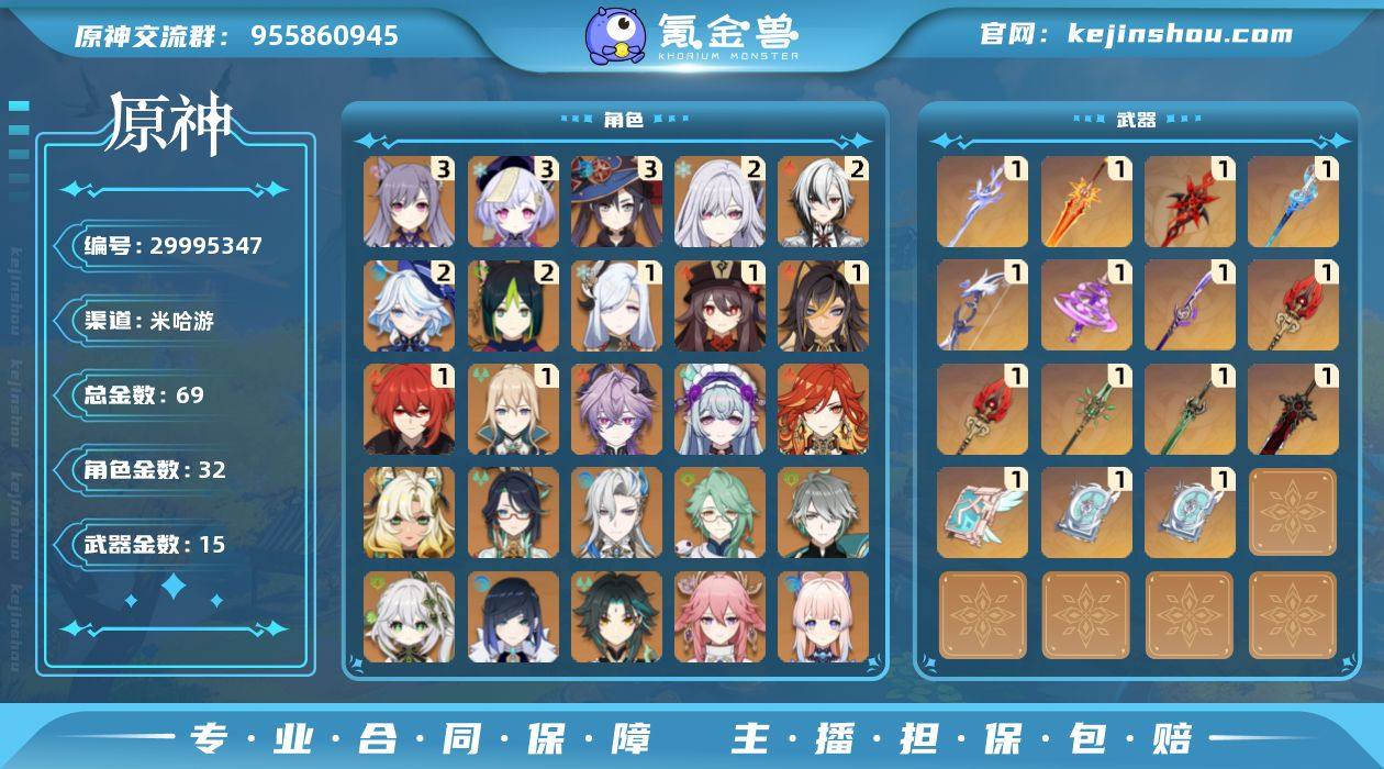 冒险等级:60 总黄数:69 男/女主:女主 5星角色数:32 5星武器数:15 纠缠之源数量:38 原石数量:82 卖家说:原神,星穹铁道双账号si邮,可提供信息,有兴趣来