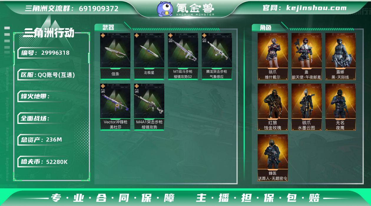 S425总资产236M,哈夫币5228w,典藏6,近战4,枪皮数量286,战场等级50 军士长,行动等级60 钻石,腾龙突击步枪-气象感应(极品S)/M4A1突击步枪-棱镜攻势(优品S)/Vector冲锋枪-美杜莎(优品A)/Vector冲锋枪-美杜莎(优品A)/K416突击步枪-命运(优品A)/M7战斗步枪-棱镜攻势S2(优品C),角色皮肤数量9,骇爪-维什戴尔/蛊-能天使午夜邮差/露娜-黑天际线/红狼-蚀金玫瑰/骇爪-水墨云图/红狼-电锯惊魂/深蓝-不破誓约/蜂医-送葬人无题密令/无名-夜鹰,近战-信条/近战-电锯惊魂/近战-北极星/近战-黑鹰,安全箱等时效性道具请以游戏内数据为准;详情请看图