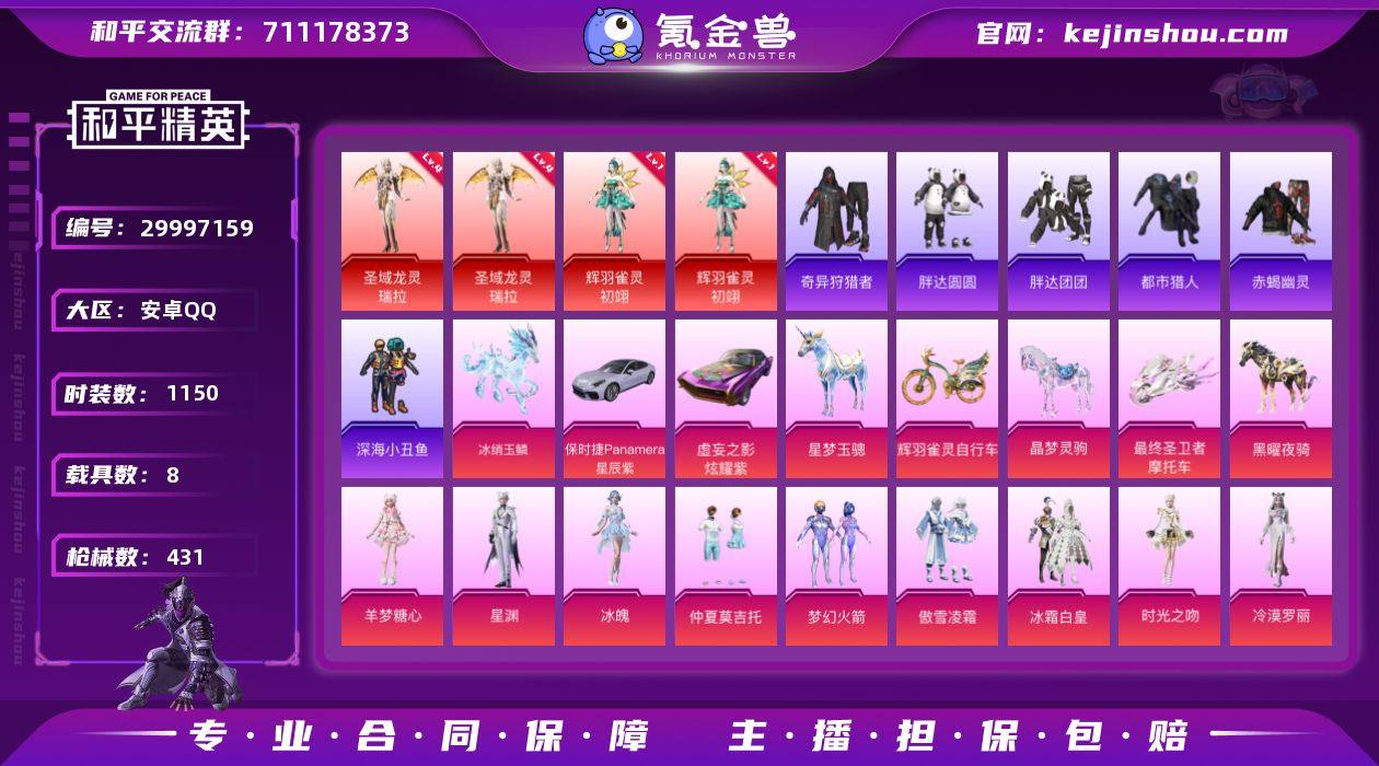 热力值:176023 载具数:8 时装数:1150 枪械数:431 战备数:332 游戏等级:66 卓越印记:5 传奇印记:2 绝世印记:1 四级圣域龙灵-瑞拉,一级辉羽雀灵-初翊 羊梦糖心,冰魄,星渊,傲雪凌霜,暗夜鎏金,宝贝奶油派,冰川粉黛,冰川幽秘,薄荷物语,冰霜白皇,白勺歌姬,彩虹甜喵,炙焰红王,呆萌星弥,第五大道,放客神游,绯穹魔姬,绯月迷踪,歌者泠鸢,幻彩电音,寒光使者,幻海仙踪,酣梦娃娃,奇迹舞步-美琪,晶梦幻蝶,狂魅哈莉,翎光蝶翼,岚岚物语,冷漠罗丽,罗征,美雪,梦幻火箭,萌物绒绒,蜜语绒猫,女娲灵识,暖熊萌萌,千金淑猫,奇迹舞步-美雪,奇迹舞步-雅雅,时光之吻,天使彩虹糖,甜梦小狐,童趣迷兔,甜心巧克力,雪国幻梦,霞光圣骑,小可学妹,星穹咏叹调,荧海星豚,樱桃泡泡,仲夏莫吉托,智耀战神 九级SCAR-L金蛇镇世,七级JS9-奇迹舞步,七级破片手榴弹-瓶中星球,六级AUG-星梦奇缘,六级M416-灵猫魔法师,五级DP-28-豹影疾电,五级AUG-暖羊咩咩,五级Kar98K-巳巳如意,五级M416-电玩时刻,五级MK14-甜梦熊击,五级烟雾弹-电雾迷城,四级ARX-无垠阁,四级AKM-幻海仙踪,四级AUG-圣斗士星矢,四级Famas-翎光蝶翼,四级GROZA-圣辉之星,四级M417-第五大道,四级MG-36-幻彩电音,三级AMR-智耀战神,三级Kar98K-圣域龙灵,三级MG3-辉羽雀灵,三级MK14-盛世惊鸿,三级P90-冷漠罗丽,三级P90-沙丘之主,三级撬棍-永恒法杖,三级Vector-最终圣卫者,三级野牛-绯月迷踪,二级AKS-74U-星穹咏叹调,二级蜜獾-荧海星豚,二级平底锅-仲夏莫吉托,二级烟雾弹-甜梦果泡,一级蜜獾-异瞳寒姬,一级平底锅-喜羊羊与灰太狼,一级M416-墨龙九天,一级MK12-雪月幻音,一级Vector-绯穹魔姬 冰绡玉鳞,保时捷Panamera(星辰紫),辉羽雀灵自行车,黑曜夜骑,晶梦灵驹,星梦玉骢,虚妄之影(炫耀紫),最终圣卫者摩托车 僚机-圣域龙宝,炫彩糖果降落伞,炫彩糖果飞行器,异瞳寒姬降落伞,节奏起飞飞行器,灵珠游龙飞行器,魔童闹海 敖丙降落伞,魔童闹海 哪吒降落伞,喜羊羊与灰太狼降落伞,无垠阁降落伞,彩虹独角兽飞行器,繁龙极客飞行器,酣梦熊熊飞行器,幻星舰长飞行器,镜域双华-灵镜之阶,灵猫魔法师飞行器,宁雨蝶飞行器,雀灵庇佑飞行器,时光之誓飞行器,甜梦小狐飞行器,桃夭倾城飞行器,万象金身飞行器,御兔特攻飞行器,月下星之子飞行器,终晖之翼飞行器,暗夜鎏金降落伞,白勺歌姬降落伞,彩虹独角兽降落伞,彩虹甜喵降落伞,第五大道降落伞,绯穹魔姬降落伞,绯月迷踪降落伞,鬼刀降落伞,幻彩电音降落伞,幻海仙踪降落伞,幻影飞狐降落伞,海渊国主降落伞,辉羽雀灵降落伞,精灵梦叶罗丽降落伞,晶梦幻蝶降落伞,临安公主降落伞,翎光蝶翼降落伞,冷漠罗丽降落伞,灵猫魔法师降落伞,洛神天依降落伞,莲影清波降落伞,梦幻火箭降落伞,萌物绒绒降落伞,蜜语绒猫降落伞,暖熊萌萌降落伞,千金淑猫降落伞,奇迹舞步降落伞,绒雪飘舞降落伞,双重狂想降落伞,圣斗士星矢降落伞,飒粉甜心降落伞,圣光天使降落伞,时光之誓降落伞,圣辉之星降落伞,盛世惊鸿降落伞,圣域龙灵降落伞,桃粉嫣然降落伞,甜梦小狐降落伞,童趣迷兔降落伞,甜心宝贝降落伞,桃夭倾城降落伞,未来歌姬降落伞,星梦奇缘降落伞,星穹咏叹调降落伞,戏水时光降落伞,雪月幻音降落伞,星月云朵降落伞,旋转彩虹降落伞,音爆索尼克降落伞,荧海星豚降落伞,湮灭星辰降落伞,樱桃泡泡降落伞,鸢尾晶梦降落伞,月影灵韵