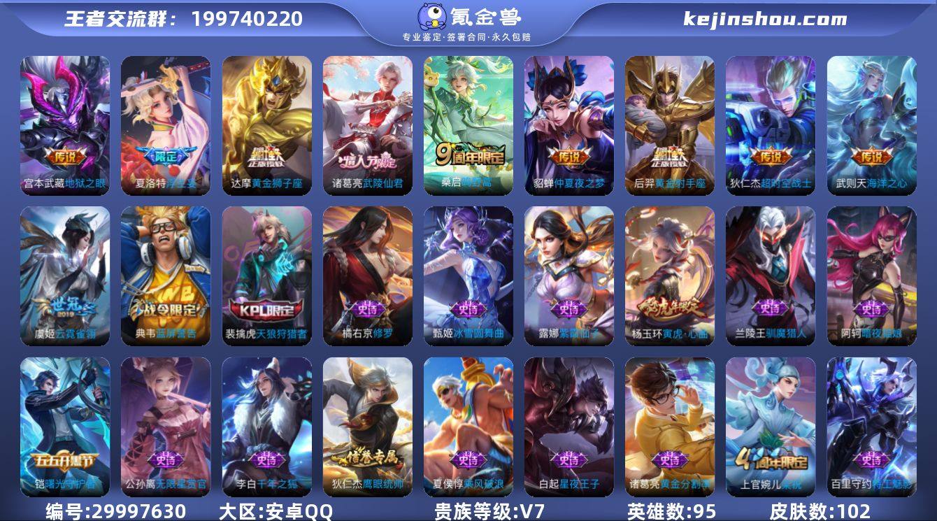 【主播推荐】实名: 可修改 性别: 男号 贵族等级: V7 英雄数: 95 皮肤数: 102 荣耀水晶: 武则天 传说皮: 黄金狮子座,黄金射手座,云霓雀翎,仲夏夜之梦,海洋之心,地狱之眼,超时空战士-狄仁杰,浮生妄 限定皮: 梁祝,天狼狩猎者,逐梦之光,武陵仙君,寅虎·心曲,鸣野蒿