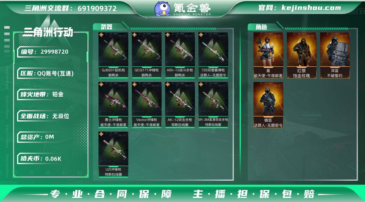 hf10669总资产93m纯币63m+午夜邮差全套+蚀金玫瑰全套+鹅鸭杀全套+特斯拉线圈全套+s5s6赛季通行证+烽火等级48+特勤部门等级一般+永久包赔