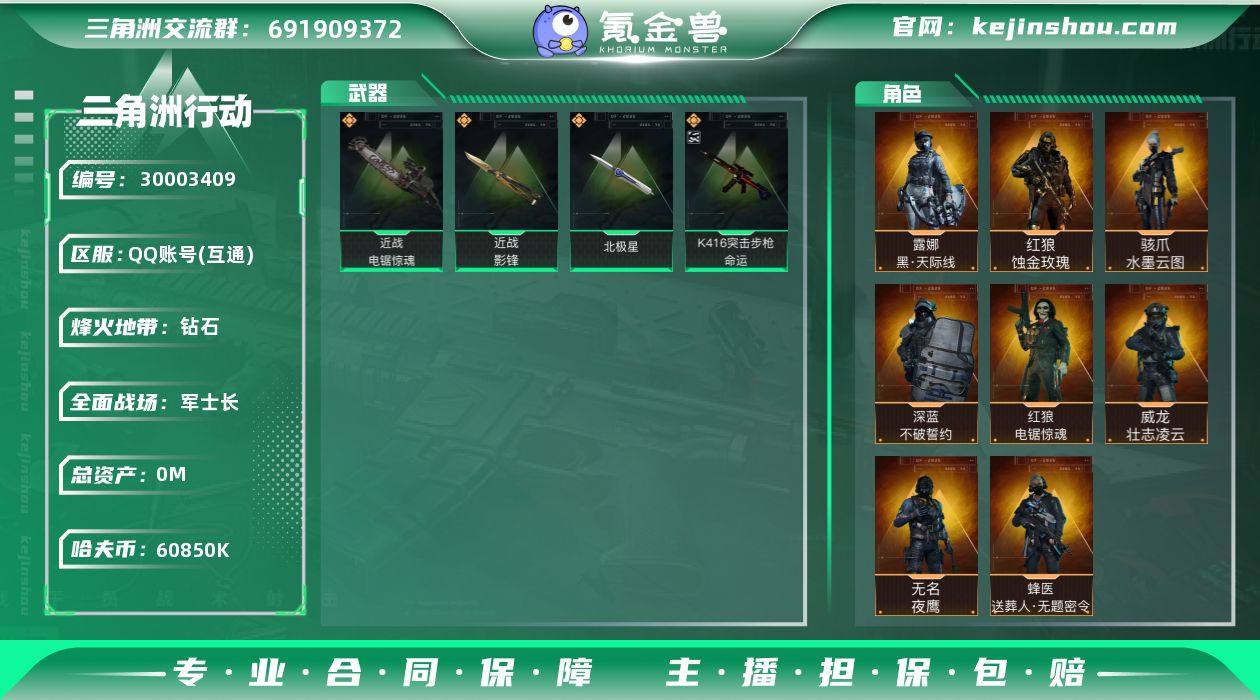 ABC9227/QQ区/可二次/钱包注销/【总资产:183M+近战影锋+近战北极星+K416突击步枪-命运(优品B)+骇爪水墨云图+红狼蚀金玫瑰+露娜黑天际线+蜂医送葬人无题密令+威龙壮志凌云+无名夜鹰+红狼电锯惊魂+深蓝不破誓约】哈夫币:6085W,武器皮肤258;烽火60级:钻石Ⅰ,战场:军士长Ⅳ,【安全箱】基础安全箱;【特勤处等级】仓库LV.8,靶场LV.6,训练中心LV.7,收藏室LV.0,潜水中心LV.1;【捆绑包10】影锋捆绑包,北极星捆绑包,电锯惊魂捆绑包,鹅鸭杀捆绑包,蚀金玫瑰捆绑包,黑天际线捆绑包,电锯惊魂干员捆绑包,特斯拉线圈捆绑包,捞点薯条捆绑包,曙光捆绑包;【干员皮肤8】骇爪水墨云图,红狼蚀金玫瑰,露娜黑天际线,蜂医送葬人无题密令,威龙壮志凌云,无名夜鹰,红狼电锯惊魂,深蓝不破誓约;【典藏皮肤】K416突击步枪-命运(优品B);【近战皮肤】近战武器-影锋,近战武器-北极星,近战武器-电锯惊魂,近战武器-黑鹰;【步枪皮肤】K416突击步枪-命运,M4A1突击步枪-阿米娅,M4A1突击步枪-蚀金玫瑰,ASh-12战斗步枪-鹅鸭杀,AK-12突击步枪-夜鹰,AK-12突击步枪-特斯拉线圈,SCAR-H战斗步枪-启航,SCAR-H战斗步枪-水墨云图,SCAR-H战斗步枪-铁艺苍穹,G3战斗步枪-骑士,CAR-15突击步枪-阿米娅,腾龙突击步枪-捞点薯条,K437突击步枪-北极星,KC17突击步枪-电锯惊魂,M4A1突击步枪-特勤执行,AKM突击步枪-林中猎手,QBZ95-1突击步枪-曙光,QBZ95-1突击步枪-ACE,ASh-12战斗步枪-守夜人,ASh-12战斗步枪-无极限,M16A4突击步枪-竞赛选手,AUG突击步枪-蝮蛇,AUG突击步枪-特勤执行,SG552突击步枪-尖端治疗,SCAR-H战斗步枪-囚徒,G3战斗步枪-战场英杰,PTR-32突击步枪-ACE,PTR-32突击步枪-英雄,ASVal突击步枪-尖端治疗,ASVal突击步枪-典狱官,腾龙突击步枪-无垢,腾龙突击步枪-猎鳄行动,K437突击步枪-守护者...