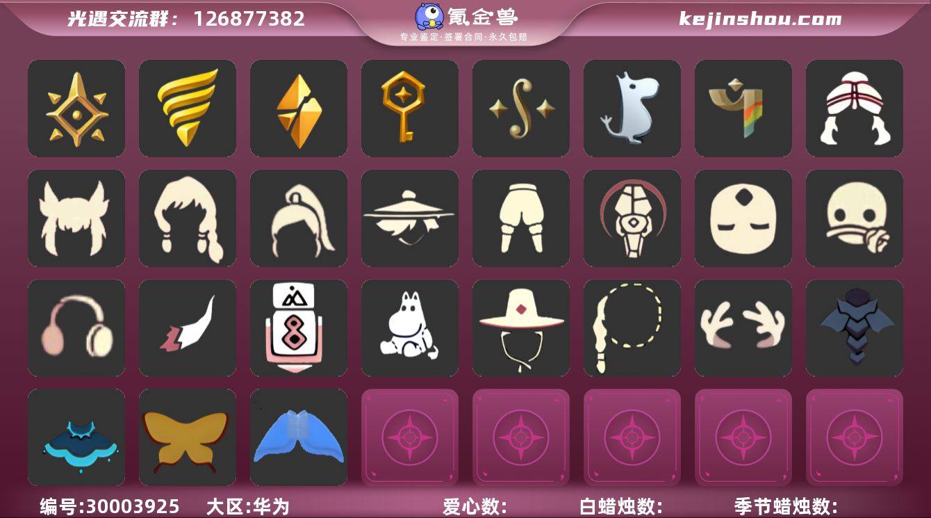 账号类型: 手机账号 季节已毕业: 小王子季,风行季,潜海季,表演季,破晓季,欧若拉季,夜行季,追忆季,九色鹿季,姆明季,彩染季 完成地图: 晨岛,云野,雨林,霞谷,暮土,禁阁 珍稀物品: 白枭,透明蝶翼斗,玫瑰花 礼包: 蝙蝠套,巫师,围巾,星球斗,小狐狸,欧若拉之翼,九色鹿角,绊爱,鹿角,蜘蛛斗,兔子鞋,秋千,茶桌,白绒金,瑞雪,女巫裙,福娃,彩虹帽,橘子,贝壳,黄伞,红伞,兔子,南瓜,枯角,雪花,猫套,猫背饰,星月头饰,彩虹耳钉,彩虹耳机,雪人鞋,创始人,姆明饰品套装 裤子: 武士裤,背带裤,搓澡巾,击剑裤,妮妮裙子,王子服,蓝绿裤,风行毕业裤子 面具: 呼吸面具,夜行毕业面具,黄眉企鹅面具,辉光羚羊面具 面饰: 红耳机 项链: 围巾 发型: 若笠,虚荣,单侧绑发,小王子发型,留辫蘑菇头,飞天盘发 头饰: 羽毛发饰,蓝色音乐会,平顶帽 斗篷: 海洋斗,绿芽,粉红绒毛斗篷,遥鲲斗篷,燕尾斗篷,冥龙斗篷,领主红斗篷,瑞雪斗篷,彩染围巾斗篷 配饰: 高音钢琴,姆明抱枕,小红伞,玫瑰花,鲲灯 亮点: 【优质装备】:表演季,白枭(帝企鹅发),武士裤,小王子季(王子季),风行季,潜海季,破晓季,透明蝶翼斗,欧若拉季(欧若拉),羽毛发饰(多羽发饰),高音钢琴(白色高脚钢琴),玫瑰花,夜行季,追忆季,妮妮裙子(妮妮长裙),姆明抱枕,小红伞(姆明红伞)(姆明大伞),九色鹿(九色鹿季),王子服(小王子套装),蓝绿裤(高领舞服),围巾(肩带),姆明季,风行毕业裤子(羽袖长袍),呼吸面具(潜水面具),夜行毕业面具(棕熊面具),黄眉企鹅面具,单侧绑发(单边小辫),小王子发型,留辫蘑菇头,粉红绒毛斗篷(绒毛斗篷),遥鲲斗篷(双翼遥鲲斗),燕尾斗篷,冥龙斗篷,领主红斗篷(暗红斗篷),鲲灯(追忆之书),辉光羚羊面具,彩染季,飞天盘发(九色鹿丸子头),蝙蝠套(蝙蝠斗篷)(南瓜头),星球斗(星球夹克),欧若拉之翼,福娃(福娃礼包)(春之日礼包)(铜钱斗),绊爱(绊爱斗篷)(绊爱礼包),秋千(情人秋千),茶桌(花憩茶桌),黄伞(夏...