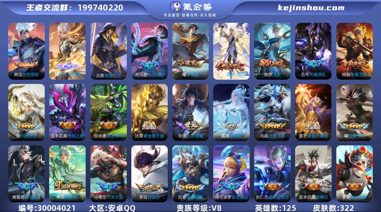 安卓QQ/最强王者/322皮肤/125英雄/1典藏/0珍品无双/1无双/0珍品传说/26传说/101史诗/9稀有英雄 【1 典藏皮肤】弑枪猎影 韩信, 【1 无双皮肤】器灵·螭龙剑 曜, 【26 传说皮肤】胖达荣荣 梦奇,启明星使 虞姬,无双飞将 马超,九山相柳 司马懿,李逍遥 曜,云鹰飞将 曜,齐天大圣 孙悟空,永曜之星 杨戬,诗剑行 李白,惊梅引 宫本武藏,地狱之眼 宫本武藏,鹤羽星尊 诸葛亮,炽阳神光 镜,霜月吟 露娜,怒海麟威 吕布,黄金狮子座 达摩,末日机甲 孙尚香,一念神魔 李信,天魔缭乱 吕布,太华 伽罗,妄想实况 马可波罗,超时空战士 狄仁杰,黄金天蝎座 墨子,诡秘之主 元歌,愿照·山河定 司空震,鸣野蒿 桑启, 【101 史诗皮肤】电玩小子 鲁班七号,末日机甲 吕布,蔬乡物语 鲁班七号,紫霞仙子 露娜,百解令 蒙犽,高山流水 庄周,银河之约 李元芳,暗影游猎 马可波罗,燃音魔法 高渐离,冰霜恋舞曲 干将莫邪,苍穹之光 项羽,猫狗日记 大乔,德古拉伯爵 刘邦,心灵战警 亚瑟,五谷丰年 鬼谷子,无心 元歌,鬼剑武藏 宫本武藏,百相守梦 黄忠,星夜王子 白起,无限星赏官 公孙离,地狱燃心 司空震,摇滚巨星 嬴政,电玩高手 狂铁,顽趣 梦奇,冰锋战神 关羽,修罗 橘右京,拒霜思 嫦娥,魅力维加斯 妲己,黄金分割率 诸葛亮,乐园奇幻夜 钟馗,偶像歌手 王昭君,荣光圣徽 蒙恬,女仆咖啡 妲己,赏金猎手 澜,星界游侠 暃,晚萤 娜可露露,猪悟能 猪八戒,舞动绿茵 蔡文姬,繁星吟游 蔡文姬,暗夜贵公子 嬴政,鹰眼统帅 狄仁杰,胡桃异想国 米莱狄,李小龙 裴擒虎,纤云弄巧 云中君,龙骑士 墨子,金属风暴 墨子,特工魅影 百里守约,猫狗日记 孙策,原初追逐者 百里玄策,逐浪之夏 李元芳,奇幻香踪 扁鹊,未来纪元 赵云,黎明之约 雅典娜,石田雨龙 后羿,鸭鸭历险记 刘禅,驭风魔法 戈娅,魔术师 狄仁杰,龙之律动 狂铁,神威 马超,顽岩魄 蒙犽,皇家上将 赵云,冰冠公主 雅典娜,辉光之辰 后羿,战舞者...