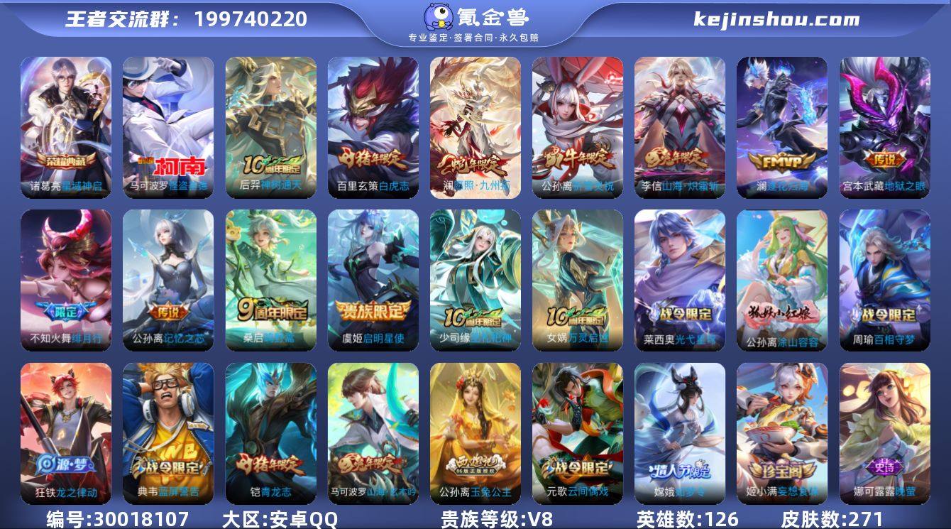 贵族等级:V8 典藏皮肤数:1 珍品无双皮肤数:0 无双皮肤数:0 珍品传说皮肤数:1 传说皮肤数:11 史诗皮肤数:74 皮肤数:271 英雄数:126 段位:星耀 卖家说:便宜出