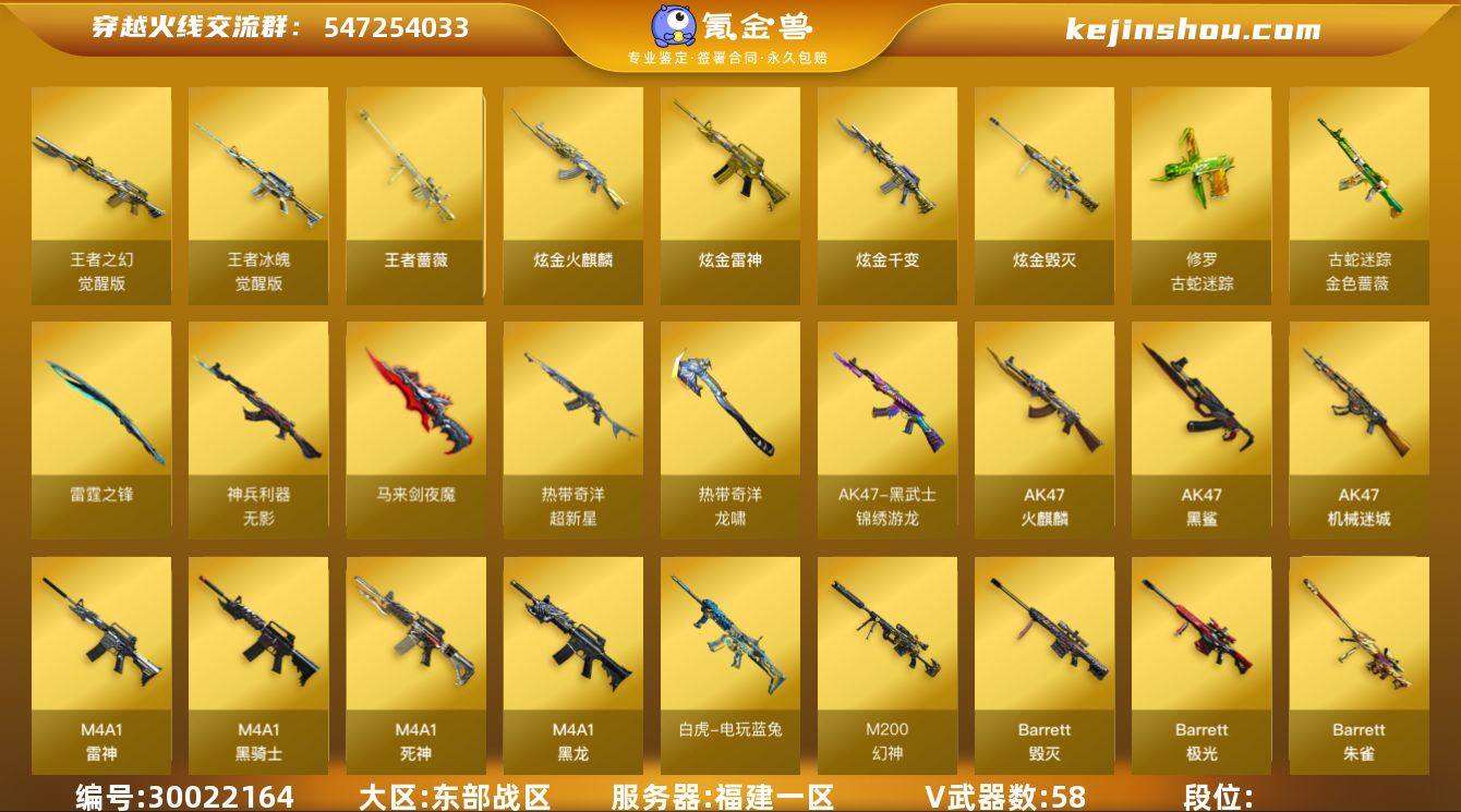 东部战区(福建一区)【爆破号】传说【传说夜影】58v【M200-幻神+皮/丹凤,竞技荣光套装,热带奇洋套装,古蛇迷踪套装,QBZ03-金色蔷薇,荣耀世冠-雷神,白虎-电玩蓝兔,AWM-裁决,柯尔特-竞技荣光*3,COP-云龙,破空枪刃-夜魔,USP-雷暴,金刚伞-电玩红兔,猫猫手套,Colt1911-小故障,Colt1911-大黄蜂,胡萝卜匕首】4王者【王者冰魄,王者之幻,王者蔷薇】4炫金【炫金火麒麟,炫金雷神,炫金毁灭】6角色【电竞教官-云悠悠,审判者,魅影,奇洋探员,蛇隐宗,王者葵-惊若翩鸿】4音效【ScarLigjt-白虎-热带奇洋音效卡,Barrett-毁灭音效卡,屠龙-动感闪耀音效卡,M4A1-黑骑士音效卡】36皮【幻神-丹凤,火麒麟-枪娘凯萨琳,雷神-烈虎,黑骑士-白马银枪,黑骑士-摸金校尉,雷神-机甲刑天,雷神-荣耀世冠AG,火麒麟-百城,毁灭-风暴,毁灭-青帝,雷神-化蛇,毁灭-耀金,火麒麟-AG战队,屠龙-春桃,雷神-诺拉】小人物枪【HK417-朱雀-蛇隐宗,裁决-雪莉杨,天龙-曼陀罗】【VIP6】截图展示段位不代表实际段位 如赛季更新等不可抗拒因素发生变化、时限道具不保证所剩时间