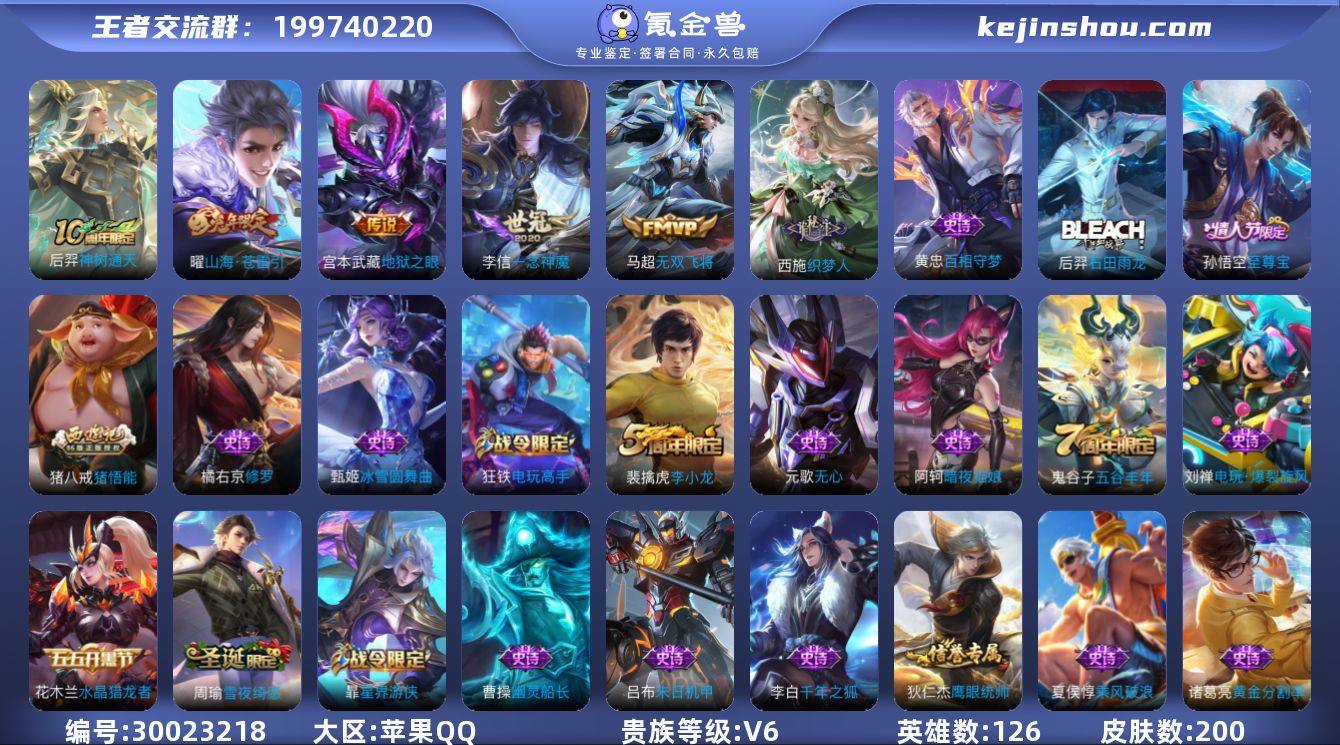 贵族等级:V6 典藏皮肤数:0 珍品无双皮肤数:0 无双皮肤数:0 珍品传说皮肤数:0 传说皮肤数:5 史诗皮肤数:51 皮肤数:200 英雄数:126 段位:无双王者