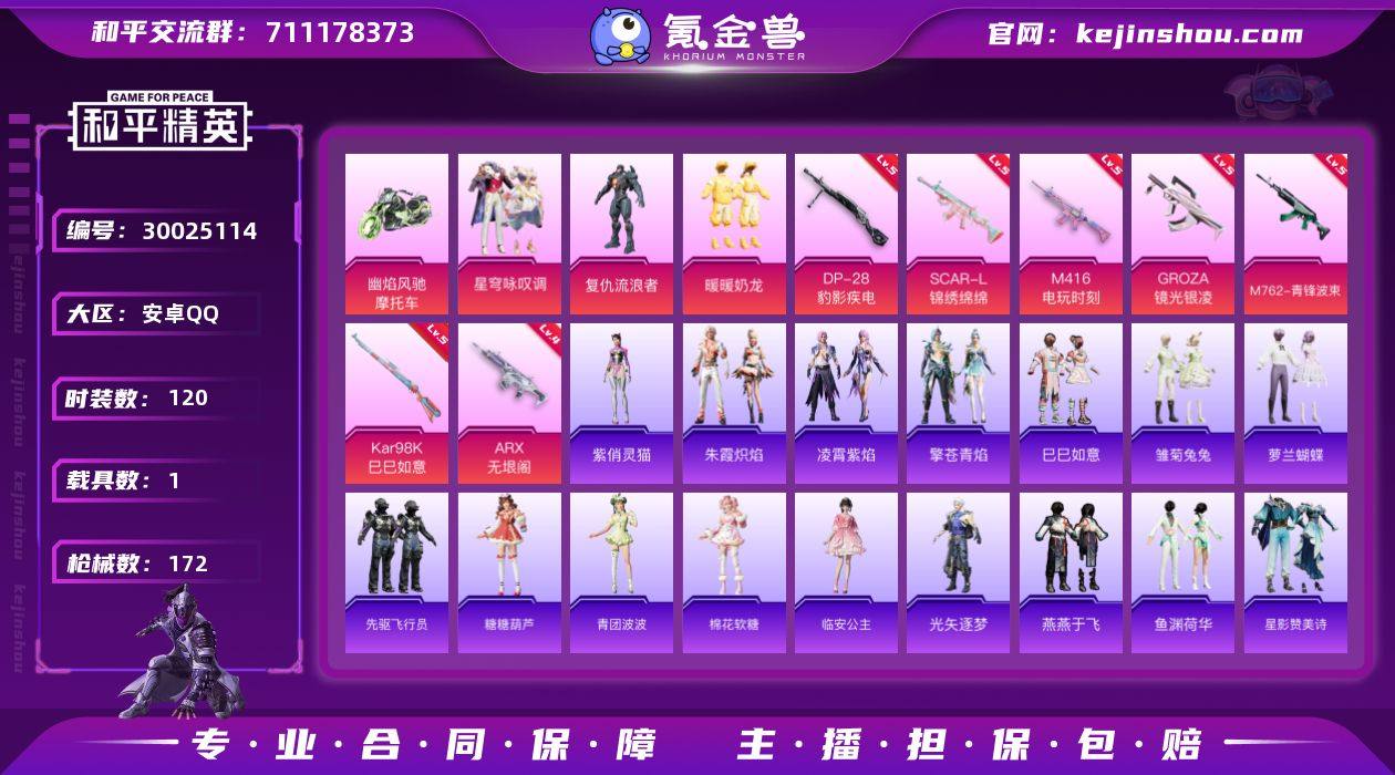 安卓 手Q-3粉装-7特效枪-1载具-2粉色飞行器-48961热力值-3王牌印记-120套装-172枪皮 【粉色载具】:幽焰风驰摩托车 【粉色套装】:角色-复仇流浪者,粉装-暖暖奶龙,粉装-星穹咏叹调 【粉色枪皮等级】:SCAR-L-锦绣绵绵(五级),M416-电玩时刻(五级),GROZA-镜光银凌(五级),M762-青锋波束(五级),ARX-无垠阁(四级),Kar98K-巳巳如意(五级),DP-28-豹影疾电(五级) 【粉色枪皮】:SCAR-L-锦绣绵绵,M416-电玩时刻,GROZA-镜光银凌,M762-青锋波束,ARX-无垠阁,Kar98K-巳巳如意,DP-28-豹影疾电 【粉色飞行器】:镜域双华-灵镜之阶 【粉色降落伞】:垂柳戏鸭降落伞,暗夜鎏金降落伞,未来歌姬降落伞,沙丘之主降落伞,忍者神龟降落伞,精灵之光降落伞,临安公主降落伞,星穹咏叹调降落伞,幻彩电音降落伞,异瞳寒姬降落伞 【稀有套装】:套装-巳巳如意,套装-雏菊兔兔,套装-萝兰蝴蝶,套装-先驱飞行员,套装-糖糖葫芦,套装-青团波波,套装-棉花软糖,角色-临安公主,角色-光矢逐梦,套装-燕燕于飞,套装-鱼渊荷华,套装-星影赞美诗,角色-绛羽幽主,套装-朱霞炽焰,套装-凌霄紫焰,套装-擎苍青焰,角色-紫俏灵猫 【稀有枪皮】:AKM-破晓战魂,AKM-缤纷海域,AKM-龙的传人,SCAR-L-夜灯,SCAR-L-玉兔迎春,SCAR-L-红色方程式,M416-糯团青竹,M416-红色方程式,M416-绯红前夜,M416-蓝色火焰,GROZA-影袭,GROZA-田园牧歌,AUG-天降萌叽,AUG-海螺星光,AUG-耀粉歌者,AUG-青春冒险家,QBZ-彩虹符号,M762-天降萌叽,M762-彩虹符号,M762-绯红前夜,G36C-星穹咏叹调,AC-VAL-天降萌叽,蜜獾-娇憨猪猪,蜜獾-绯穹魔姬,ARX-凌霄紫焰,UZI-啾咪啾咪,UZI-娇憨猪猪,UZI-影袭,UZI-月影灵韵,UMP45-夜灯,UMP45-生命誓言,Vector-田园牧歌,汤姆逊-天降萌叽,汤姆逊-奇异狩猎者,汤姆逊-耀粉歌者,汤姆逊-智耀战神,JS...