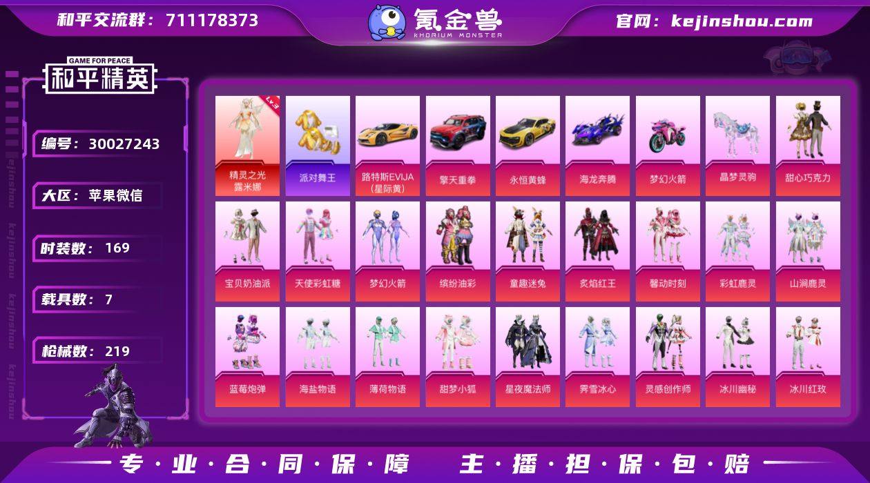 【商品标题】:苹果 微信-33粉装-13特效枪-7载具-94610热力值-9印记-169套装-219枪皮 【角色神装】:精灵之光-露米娜 【角色神装等级】:精灵之光-露米娜(三级) 【稀有载具】:路特斯EVIJA(星际黄),擎天重拳,永恒黄蜂,海龙奔腾,双人摩托-梦幻火箭,晶梦灵驹,辉羽雀灵自行车 【特效枪等级】:AKM-炫紫旋律(四级),SCAR-L-甜梦小狐(六级),M416-至情至圣(八级),GROZA-精灵之光(三级),AUG-暖羊咩咩(五级),UMP45-相思残雪(七级),Vector-灵感创作师(五级),AKS-74U-信仰神谕(五级),Kar98K-未来歌姬(四级),Kar98K-巳巳如意(五级),SLR-暗夜玫瑰(一级),MG3-辉羽雀灵(二级) 【优质套装】:粉装-甜心巧克力,粉装-宝贝奶油派,粉装-天使彩虹糖,粉装-梦幻火箭,粉装-缤纷油彩,粉装-童趣迷兔,粉装-炙焰红王,粉装-馨动时刻,粉装-彩虹鹿灵,粉装-山涧鹿灵,粉装-蓝莓炮弹,粉装-海盐物语,粉装-薄荷物语,粉装-甜梦小狐,粉装-星夜魔法师,粉装-霁雪冰心,粉装-灵感创作师,粉装-冰川幽秘,粉装-冰川红玫,粉装-盖世英雄,粉装-寒光使者,粉装-第五大道,角色-白勺歌姬,角色-呆萌星弥,角色-小可学妹,粉装-未来歌姬,角色-严莉莉,角色-美琪,角色-千金淑猫,粉装-雪月幻音,角色-狂魅哈莉,角色-冷漠罗丽,角色-绯月迷踪 【稀有套装】:套装-龟仙人,套装-绒宝小鹅,套装-巳巳如意,套装-小鸟芋圆,套装-雏菊兔兔,套装-萝兰蝴蝶,套装-小熊娃娃,角色-狂花道·雅典娜,套装-糖糖葫芦,套装-青团波波,套装-棉花软糖,角色-摩登魅猫,套装-黑曜寓言,角色-俏兔智灵,角色-光矢逐梦,套装-燕燕于飞,套装-鱼渊荷华,套装-晶灵使者,套装-晶辉守护,角色-蜜桃派对,套装-白辉玉蕊,套装-雪夜云雾,套装-晨曦轻云,套装-粉恋花,套装-紫幽梦,套装-蓝冰羽,套装-星影赞美诗,套装-星渊小夜曲,套装-云朵鹅,...