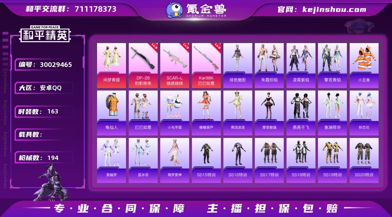 安卓 手Q-1粉装-3特效枪-0载具-2粉色飞行器-54972热力值-13王牌印记-163套装-194枪皮 【热门品类】:套装-小丑鱼,套装-龟仙人 【粉色套装】:粉装-闲梦青缨 【粉色枪皮等级】:SCAR-L-锦绣绵绵(五级),Kar98K-巳巳如意(五级),DP-28-豹影疾电(五级) 【粉色枪皮】:SCAR-L-锦绣绵绵,Kar98K-巳巳如意,DP-28-豹影疾电 【粉色降落伞】:幻影战神降落伞,百万伏特降落伞,炫光之旅降落伞,BEARBRICK降落伞,异瞳寒姬降落伞 【稀有套装】:套装-龟仙人,套装-巳巳如意,套装-小鸟芋圆,套装-糖糖葫芦,套装-青团波波,角色-摩登魅猫,套装-燕燕于飞,套装-鱼渊荷华,套装-粉恋花,套装-紫幽梦,套装-蓝冰羽,角色-瑰梦爱神,套装-朱霞炽焰,套装-凌霄紫焰,套装-擎苍青焰,角色-绯色魅影 【稀有枪皮】:AKM-破晓战魂,AKM-缤纷海域,AKM-萌趣颜团子,AKM-虎虎生威,AKM-龙的传人,M16A4-幻世战舞者,M16A4-红色方程式,M16A4-蓝色火焰,SCAR-L-夜灯,SCAR-L-玉兔迎春,SCAR-L-红色方程式,M416-糯团青竹,M416-红色方程式,M416-蓝色火焰,GROZA-田园牧歌,AUG-耀粉歌者,AUG-青春冒险家,M762-天降萌叽,M762-彩虹符号,Mk47-妙红点点,Mk47-青春冒险家,G36C-时空追击者,G36C-星穹咏叹调,AC-VAL-快闪甜心,蜜獾-天降萌叽,蜜獾-娇憨猪猪,ACE32-蓝晶绮麟,ARX-凌霄紫焰,UZI-啾咪啾咪,UZI-天降萌叽,UZI-娇憨猪猪,UZI-炫彩节奏,UZI-红色方程式,UMP45-夜灯,UMP45-时空追击者,UMP45-涂山之恋,UMP45-生命誓言,UMP45-蓝色火焰,Vector-焰鹰斗篷,Vector-生命誓言,Vector-田园牧歌,汤姆逊-暗夜鎏金,汤姆逊-炫彩节奏,汤姆逊-耀粉歌者,野牛-夜灯,野牛-青春冒险家,MP5K-飒粉甜心,JS9-凌霄紫焰,P90-快闪甜心,P90-巳巳如意,Kar98K-彩虹符号,Kar98K-影袭,Kar98K-红色方程式,Kar98K-星穹咏叹调,AWM-焰...