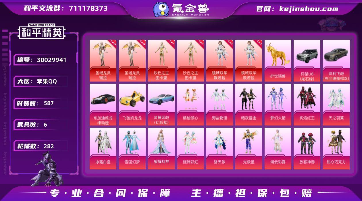 热力值:114042 载具数:6 时装数:587 枪械数:282 战备数:203 游戏等级:63 卓越印记:1 传奇印记:0 绝世印记:0 三级圣域龙灵-瑞拉,一级镜域双华-欧若拉,一级沙丘之主-图卡盟 暗夜鎏金,宝贝奶油派,缤纷油彩,冰霜白皇,炙焰红王,纯珍童话,呆萌星弥,第五大道,放客神游,光极星,海盐物语,橘柚倾心,洛天依,梦幻火箭,天使彩虹糖,圣堂之誓,甜心巧克力,天之羽翼,雪国幻梦,小可学妹,旋转彩虹,鸢尾晶梦,烟云彩露,智耀战神 七级AUG-超新星,七级UMP45-相思残雪,六级SCAR-L-童趣迷兔,五级AMR-炫光之旅,五级AWM-橘柚倾心,五级GROZA-焦糖拿铁,五级M249-彩虹甜喵,五级MG3-洛神天依,五级PKM-江南烟雨,五级烟雾弹-猫咪绅士,四级AKS-74U-星穹咏叹调,三级DP-28-豹影疾电,三级DP-28-圣堂之誓,三级Kar98K-巳巳如意,三级Kar98K-圣域龙灵,三级M24-镜域双华,三级M416-墨龙九天,三级P90-沙丘之主 布加迪威龙(律动橙),宾利飞驰(布罗德盖棕双色),飞驰奶龙龙,护世瑞兽,灵翼风驰(幻彩蓝),仰望U8(龙石绿) 僚机-萌兔起飞,镜域双华-灵镜之阶,雀灵庇佑飞行器,水晶纸鸢飞行器,太空嘟嘟飞行器,天之羽翼飞行器,曦光华影飞行器,绚金瑰梦飞行器,暗夜鎏金降落伞,彩虹甜喵降落伞,第五大道降落伞,精灵梦叶罗丽降落伞,精灵之光降落伞,江南烟雨降落伞,橘柚倾心降落伞,镜域双华降落伞,洛神天依降落伞,烈焰拳霸降落伞,梦幻火箭降落伞,墨龙九天降落伞,暖熊萌萌降落伞,拳皇·狂花道降落伞,千金淑猫降落伞,忍者神龟降落伞,沙丘之主降落伞,圣堂之誓降落伞,圣域龙灵降落伞,童趣迷兔降落伞,甜心宝贝降落伞,天之羽翼降落伞,炫光之旅降落伞,星穹咏叹调降落伞,旋转彩虹降落伞,音爆索尼克降落伞,筑梦精灵降落伞,炙焰牛王降落伞 懒羊羊,SS34特训套装,暴风机械师,冰公主,滨海假日,冰河战士,贝斯之夜,春光漫游,雏菊兔兔,长空猛禽,春日漫步,纯真浪花,达芬奇,蝶变,大橘大利,都市漫游者,蝶吟花词,淡雅花蕊,电音精灵,菲菲,绯格组合,飞狐塔尔斯,粉恋花,粉团憨憨,飞行日记,龟仙人,光之冒险,幻彩翩翩,海岛探路者,鹤鸣,虎虎生威吉莉,活力之心,和煦暖阳,湖雨初晴,幻羽潜行,金戈铁马,惊鸿侠骨,娇憨猪猪,竞技名士,吉莉礼服,极速光影,军械专家,锦衣飞扬,酷潮明星,空岛之星,快闪甜心,空投萌叽,蓝冰羽,龙的传人,龙魂突击队,萝兰蝴蝶,黎明保卫者,灵蜜圈圈,浪漫樱花,莱茵河畔,恋语绒绒,猎影月神,摩登艾咪,摩登魅猫,妙红点点,棉花软糖,萌黄之夏,果汁能量,麻辣教官,懵萌河马,曼妙人鱼,萌趣咩咩,萌趣颜团子,明鸳圣池,卖崽青蛙,霓虹极客,霓虹街区,怒火燎原,柠萌假日,牛气冲天,浓情蜜辣,暖心橘喵,暖心熊熊,轻风白浪,情公主,沁蓝冰爽,绮丽涂鸦,俏皮奶喵,青团波波,骑行爱好者,千禧之恋,云朵鹅,瑞龙福将,热情海星,绒绒粉兔,深海梦境,时空追击者,沙漠兵团,神气柴柴,SS15特训,SS16特训,SS17特训,SS18特训,SS19特训,SS20特训,SS21特训,SS22特训,SS23特训,SS24特训,SS25特训,SS26特训,SS27特训,SS28特训,SS29特训,SS30特训套装,SS31特训套装,SS32特训套装,SS33特训套装,酸甜橘柚,探宝勇士,天籁歌者,甜蜜告白,甜梦熊熊,糖糖葫芦,甜心亚梦,铁血战翼,团圆交子,听雨铃兰,田园牧歌,特种颜团子,王牌教练,无暇誓言,绚烂繁星,雪绒豹,雪山精英,星途旅人,香榭