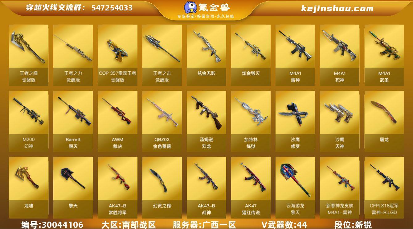 广东一区-44V-11王者-2炫金 【热门武器】:QBZ03-金色蔷薇,M200-幻神,死亡之眼,汤姆逊-烈龙*4,加特林-炼狱,沙鹰-修罗*2 【王者炫金武器】:炫金无影,炫金毁灭 【音效卡】:Barrett-毁灭音效卡 【皮肤】:QBZ03-巅峰荣耀皮肤,裁决-流光秘银,雷神-暗月,雷神-R.LGD-CFPLS18冠军,雷神-宇航兔皮肤,M4A1-雷神-新春神龙皮肤,火麒麟-雷神,火麒麟-平天大圣,毁灭-星空,毁灭-黑大圣皮肤,天启-暗月,AK47-B-常胜将军-刘备,AK47-B-常胜将军-孙权,修罗-能量核心,修罗-冠军之魂,屠龙-春桃 皮肤,擎天-蒸汽钟表 皮肤 【角色】:乔伊教练,云海玲珑,暗夜-X,飞虎队-X,风暴女,兰-新年限定,零-水下丽影,灵狐者-黄金海岸,灵狐者-七夕宝贝,龙儿,玫瑰花神,潘多拉-X,潘多拉-甜心教官,铁骑荣耀,五号兵器-赛博朋克,新娜塔莎,樱-战斗天使,影武者-X,幽,游珑儿 【人偶武器】:天龙-曼陀罗,Barrett-云海玲珑,迷你牛魔王,夺魂,迷你牛牛,迷你生化手雷,闪光弹-小乔,闪光弹-貂蝉,高爆手雷-大乔 【暴走生化】:死亡之眼,超级对讲机 【挑战大师】:激光毁灭者III 【英雄级武器】:M4A1-雷神,M4A1-死神,M4A1-武圣,QBZ03-金色蔷薇,AK-47-猩红传说,AK47-B-战神,AK47-B-常胜将军,Barrett-毁灭,AWM-裁决,M200-幻神,王者之力-觉醒版,加特林-炼狱,汤姆逊-烈龙*4,沙鹰-修罗*2,沙鹰-天神*3,COP 357-雷霆王者-觉醒版*2,屠龙*3,龙啸,擎天,幻灵之锋,擎天-云海游龙,王者之啸-觉醒版,王者之击-觉醒版,高爆手雷-幻灵*3,手雷-云海游龙,闪光弹-幻灵*3,闪光弹-雷霆王者-觉醒版*2,烟雾弹-幻灵*3,烟雾弹-云龙,烟雾弹-雷霆王者-觉醒版*2 【道具】:XROCK炫彩背包,超级背包,女皇终结者-魔龙之吻,救世主-黑桃战神,绿色巨人,灵魂忍者,变异宝贝,迷雾幽灵,生化弹匣,夺命之镰,防化服*3,金...