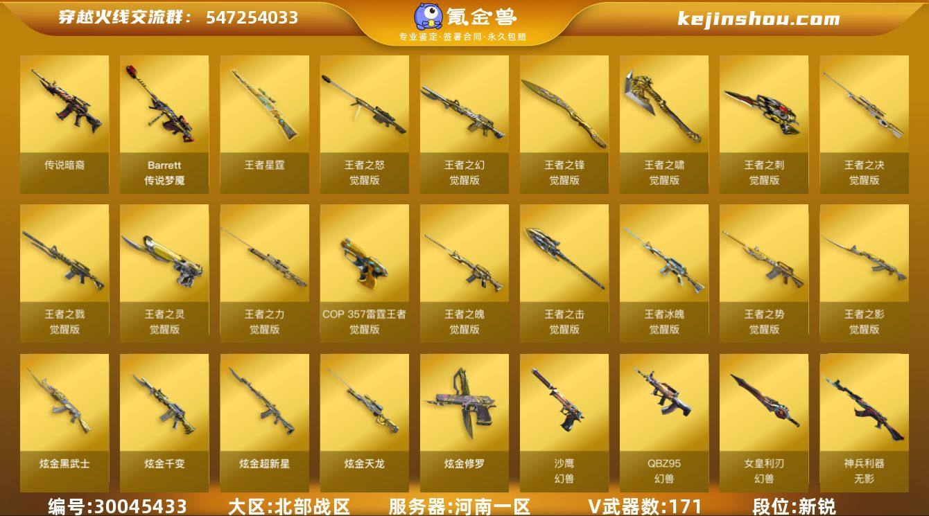 河南一区-180V-27王者-5炫金 【传说武器】:传说暗裔,传说梦魇 【传说角色】:传说影煞 【热门武器】:传说暗裔,传说梦魇,QBZ03-金色蔷薇*2,M14EBR-玄武,Scar Light-白虎,HK417-朱雀,M4A1-青龙*3,M200-幻神,M200-竞技荣光,白虎-电玩蓝兔,柯尔特-冠军之特*3,荣耀世冠-柯尔特,Kar98K-星神,炼狱-迷你小钢*2,M4A1-黑骑士*2,汤姆逊-烈龙*6,加特林-炼狱*3,斯泰尔-蝴蝶,火麒麟-绝迹,COP-白鲨,USP-雷暴,COP-堕天神*2,沙鹰-修罗*2,炽芒蝶刃,黄金猫猫手套-白鲨,高爆手雷-幻兽*5 【王者炫金武器】:王者星霆,炫金千变,炫金武士,炫金超新星,炫金天龙,炫金修罗 【音效卡】:M200-幻神音效卡,M4A1-雷神音效卡,M4A1-黑骑士音效卡,Barrett-毁灭音效卡,QBZ03-金色蔷薇音效卡,AWM-昌龙-怀旧音效卡 【皮肤】:幻神-宠儿-2021MVP,M200-幻神-N9-2022MVP,白虎-虎啸皮肤,AWM-裁决-凤灵皮肤,星神-破竹皮肤,雷神-能量核心,雷神-荣耀之魄,雷神-耀金皮肤,雷神-宠儿-2019MVP,雷神-烈虎皮肤,雷神-机甲刑天皮肤,雷神-宇航兔皮肤,雷神-维纳斯皮肤*2,火麒麟-轻羽皮肤,火麒麟-平天大圣*2,火麒麟-百城,火麒麟-心动糖果,毁灭-暗月*3,毁灭-荣耀之怒,毁灭耀金皮肤,毁灭-星空,毁灭-战神张飞,毁灭-黑大圣皮肤,毁灭-风暴,毁灭-魔灵皮肤,毁灭-神秘黑洞皮肤,毁灭-黑曼巴 皮肤,M4A1-千变-孔明皮肤,黑龙-能量核心*2,黑龙-暗月,M4A1-黑龙-361,黑骑士-暗月*2,黑骑士-地狱火,黑骑士-战神马超,无影-暗月*3,无影-能量核心,无影-霓裳皮肤,天启-暗月,战神-粉色甜心皮肤,战神-紫绶金章皮肤,战神-流金岁月皮肤*2,AK47-B-常胜将军-曹操*4,AK47-B-常胜将军-孙权*3,天龙-能量核心,AWM-天龙-传奇白鲨,极光-能量核心,炼狱-玩具枪皮肤,加特林-炼狱-钟馗皮肤,修罗-CF STAR,修罗-能量核心...