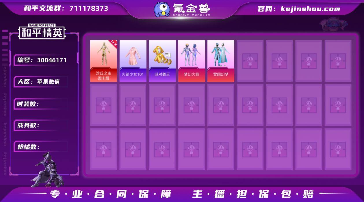 【商品标题】:苹果 微信-无敌战神框-4神装-43粉装-37特效枪-9载具-29粉色飞行器-211037热力值-24王牌印记-365套装-517枪皮 【红色神装等级】:辉羽雀灵-初翊(一级),圣域龙灵-瑞拉(一级),梦海之灵-妮芮妲(一级),沙丘之主-图卡盟(五级) 【红色角色神装】:辉羽雀灵-初翊,圣域龙灵-瑞拉,梦海之灵-妮芮妲,沙丘之主-图卡盟 【热门品类】:粉装-怪诞乔克,粉装-雪国幻梦,粉装-梦幻火箭,粉装-童趣迷兔,套装-寒蝎幽灵,套装-S1赛事,套装-浪漫天命,套装-都市猎人,套装-派对舞王,套装-深海小丑鱼,套装-小丑鱼,套装-奇异狩猎者,套装-胖达团团,套装-天网终结者,套装-动感兔斯基人偶服,套装-龟仙人,套装-暗影哥特,套装-浪漫波比,套装-软软马卡龙,角色-8号机,角色-Mark.06,小丑红鼻头,小恶魔头饰,熔岩游骑兵面罩,熔岩游骑兵连帽夹克,套装-红熊茄茄 【粉色载具】:宝马M4(圣保罗黄),虚妄之影(炫耀紫),合金龙骨(蓝),盛世惊鸿摩托车,僚机-圣域龙宝,星梦玉骢,护世瑞兽,晶梦灵驹,黑曜夜骑,辉羽雀灵自行车 【粉色套装】:粉装-数码大师,粉装-怪诞乔克,粉装-甜心巧克力,粉装-宝贝奶油派,粉装-天使彩虹糖,粉装-水曜玄武,粉装-雪国幻梦,粉装-蝶舞迷情,粉装-梦幻火箭,粉装-金属狂野,粉装-放客神游,粉装-向日葵,粉装-银刃赛罗,粉装-冰霜白皇,粉装-童趣迷兔,粉装-炙焰红王,粉装-星之彼岸,粉装-蜜桃特工,粉装-蝶舞蔷薇,粉装-彩虹鹿灵,粉装-蓝莓炮弹,粉装-橘柚倾心,粉装-暖熊萌萌,粉装-傲雪凌霜,粉装-旋转彩虹,粉装-冰川红玫,粉装-第五大道,粉装-仲夏莫吉托,角色-小可学妹,粉装-天衡星秤,粉装-莲影清波,角色-烟云彩露,角色-美琪,角色-初号机 觉醒Ver.,角色-千金淑猫,角色-月影灵韵,角色-月下星之子,角色-樱桃泡泡,粉装-星穹咏叹调,粉装-幻彩电音,角色-...