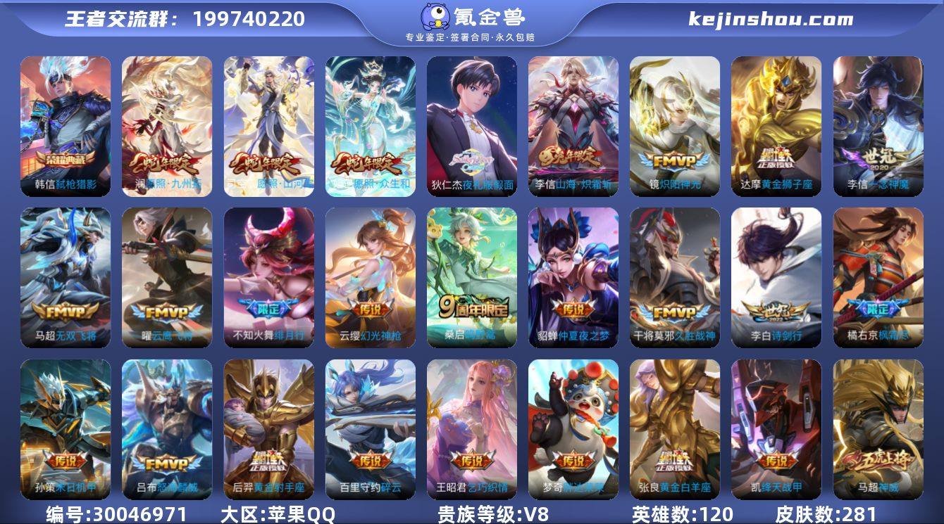 秒换绑【V8 26传说 金标李信 韩信典藏 都是历史标】苹果QQ/V8/至圣王者/281皮肤/120英雄/1典藏/26传说/79史诗/7稀有英雄 【1 典藏皮肤】弑枪猎影 韩信, 【26 传说皮肤】枫霜尽 橘右京,胖达荣荣 梦奇,启明星使 虞姬,碎云 百里守约,无双飞将 马超,云鹰飞将 曜,夜礼服假面 狄仁杰,诗剑行 李白,仲夏夜之梦 貂蝉,炽阳神光 镜,黄金射手座 后羿,怒海麟威 吕布,乞巧织情 王昭君,黄金狮子座 达摩,绯月行 不知火舞,久胜战神 干将莫邪,末日机甲 孙策,山海·炽霜斩 李信,一念神魔 李信,绛天战甲 铠,黄金白羊座 张良,愿照·九州拓 澜,愿照·众生和 妲己,幻光神枪 云缨,愿照·山河定 司空震,鸣野蒿 桑启, 【79 史诗皮肤】末日机甲 吕布,紫霞仙子 露娜,百解令 蒙犽,高山流水 庄周,银河之约 李元芳,暗影游猎 马可波罗,天秀·音浪 高渐离,妄想食味 姬小满,糖绘人间 亚连,德古拉伯爵 刘邦,心灵战警 亚瑟,五谷丰年 鬼谷子,无心 元歌,鬼剑武藏 宫本武藏,迷踪丽影 阿轲,星夜王子 白起,无限星赏官 公孙离,地狱燃心 司空震,摇滚巨星 嬴政,顽趣 梦奇,修罗 橘右京,拒霜思 嫦娥,魅力维加斯 妲己,黄金分割率 诸葛亮,荣光圣徽 蒙恬,女仆咖啡 妲己,繁星吟游 蔡文姬,鹰眼统帅 狄仁杰,胡桃异想国 米莱狄,孙行者 孙悟空,李小龙 裴擒虎,纤云弄巧 云中君,金属风暴 墨子,特工魅影 百里守约,猫狗日记 孙策,原初追逐者 百里玄策,逐浪之夏 李元芳,时之祈愿 云中君,未来纪元 赵云,朱雀志 百里守约,黎明之约 雅典娜,魔术师 狄仁杰,神威 马超,皇家上将 赵云,功夫厨神 程咬金,梁祝 上官婉儿,天才门将 刘禅,圣诞恋歌 貂蝉,云间偶戏 元歌,水晶猎龙者 花木兰,烈魂 黄忠,御风骁将 吕布,圣诞狂欢 吕布,魅语 不知火舞,器灵·浮梦炉 赵怀真,天狼溯光者 伽罗,地狱岩魂 廉颇,茶境仙 孙膑,蔷薇恋人 孙尚香,冰雪圆舞曲 甄姬,火炮绅士 黄忠,航海奇遇记 老夫子,千年之狐 李白,节...