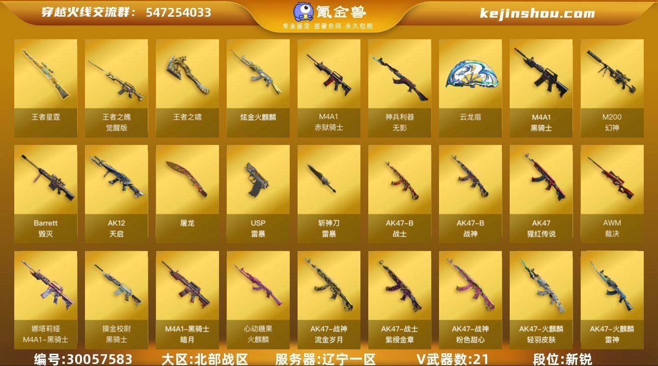 段位:新锐 VIP等级:VIP6 V武器数:21 王者武器数:4 炫金武器数:1 王者星霆,王者之魄-觉醒版,王者之啸 炫金火麒麟 M4A1-赤狱骑士,无影-神兵利器,云龙扇,M4A1-黑骑士,M200-幻神,Barrett-毁灭,AK12-天启,屠龙,USP-雷暴,斩神刀-雷暴,AK47-B-战士,AK47-B-战神,AK-47-猩红传说,裁决 Barrett-毁灭音效卡