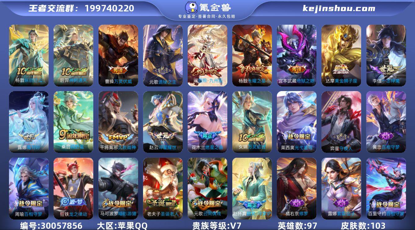 贵族等级:V7 典藏皮肤数:0 珍品无双皮肤数:0 无双皮肤数:0 珍品传说皮肤数:0 传说皮肤数:14 史诗皮肤数:30 皮肤数:103 英雄数:97 段位:荣耀王者 卖家说:王者赵怀真一万一40段对抗路瓦也抽了一千佐助侠影江湖的主题也有金铲铲之战三个永恩