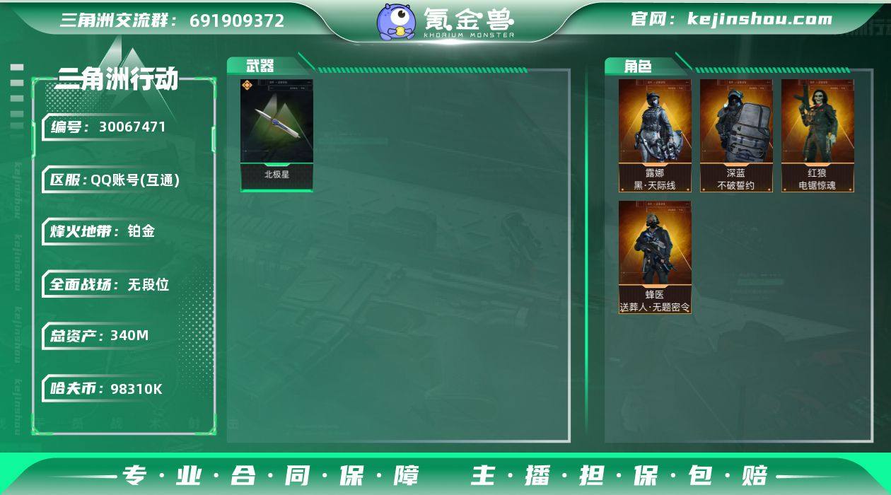 实名: 不可修改 烽火地带段位: 铂金 全面战场段位: 无段位 总资产: 340000000 哈夫币: 98310000 传说武器皮肤: 近战-北极星 干员外观: 蜂医-送葬人·无题密令(S5),露娜-黑·天际线,深蓝-不破誓约(S6),红狼-电锯惊魂 亮点: 【1486】惠1758228总资产340M,哈夫币9831w,近战2 枪皮数量128,露娜-黑天际线/红狼-电锯惊魂/深蓝-不破誓约/蜂医-送葬人无题密令,近战-北极星,战场等级26 上等兵, 行动等级60 铂金,安全箱等时效性道具请以游戏内数据为准,详情请看图【个人信息】战场等级26 上等兵, 行动等级60 铂金【哈夫币】9831.6w【总资产】340M【货币】183三角券/65三角币【特勤处】技术中心Lv.3/工作台Lv.3/制药台Lv.3/防具台Lv.3//指挥中心Lv.5/训练中心Lv.7/靶场Lv.5/潜水中心Lv.1/收藏室Lv.1【角色皮肤】露娜-黑天际线/红狼-电锯惊魂/深蓝-不破誓约/蜂医-送葬人无题密令【近战皮肤】近战-北极星/近战-黑鹰【挂饰】余烬之影/阿萨拉霰弹兵/阿萨拉狙击兵/阿萨拉徽章/挂饰-黑/挂饰-黑天际线【步枪皮肤】KC17突击步枪-电锯惊魂/AK-12突击步枪-特斯拉线圈/SCAR-H战斗步枪-启航/M4A1突击步枪-蚀金玫瑰/G3战斗步枪-狩猎时刻/M16A4突击步枪-狩猎时刻【冲锋枪皮肤】勇士冲锋枪-深海恐惧/Vector冲锋枪-狩猎时刻/UZI冲锋枪-特斯拉线圈/MP7冲锋枪-无垢/勇士冲锋枪-能天使-午夜邮差【轻机枪皮肤】PKM通用机枪-荒野求生【精准射击步枪皮肤】PSG-1射手步枪-无垢【狙击步枪皮肤】M700狙击步枪-蝮蛇/SV-98狙击步枪-林中猎手/M700狙击步枪-竞技风/SVD狙击步枪-阿萨拉工艺【特殊武器】复合弓-黑天际线【载具皮肤】突击直升机-紫电/侦察直升机-紫电/全地形车-警戒线/轮式突击炮-荣耀/M1A4坦克-紫电(典藏皮肤颜色请以典藏展示为准,安全箱等时效性道具请以游戏内数据为准) ,露娜-黑·天际线,深蓝-不破誓约,蜂医-送葬人·无题密令,...
