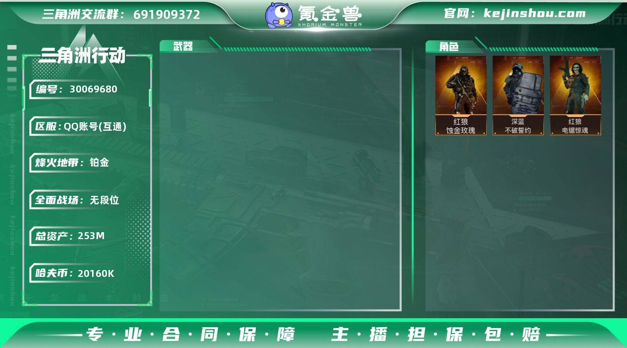 实名: 不可修改 烽火地带段位: 铂金 全面战场段位: 无段位 总资产: 253000000 哈夫币: 20160000 干员外观: 红狼-蚀金玫瑰,深蓝-不破誓约(S6),红狼-电锯惊魂 亮点: 【1226】慧3815786 总资产253M,哈夫币2016w,近战1 枪皮数量122,红狼-蚀金玫瑰/红狼-电锯惊魂/蜂医-送葬人无题密令,战场等级12军士长, 行动等级1铂金,安全箱等时效性道具请以游戏内数据为准,详情请看图【个人信息】战场等级12军士长, 行动等级1铂金【哈夫币】2016.2w【总资产】253M【货币】298三角券/31三角币【特勤处】技术中心Lv.3/工作台Lv.3/制药台Lv.3/防具台Lv.3/仓库Lv.10/指挥中心Lv.6/训练中心Lv.7/靶场Lv.7/潜水中心Lv.2/收藏室Lv.2【仓库】338AP【角色皮肤】红狼-蚀金玫瑰/红狼-电锯惊魂/蜂医-送葬人无题密令【近战皮肤】近战-黑鹰【挂饰】诡影喷火兵/挂饰-彩蛋/挂饰-水墨云图/挂饰-蚀金玫瑰/挂饰-黑/火箭玫瑰/余烬之影/阿萨拉徽章/挂饰-阿米娅【步枪皮肤】AUG突击步枪-蝮蛇/M4A1突击步枪-蚀金玫瑰/AK-12突击步枪-特斯拉线圈/M16A4突击步枪-狩猎时刻/PTR-32突击步枪-英雄/SCAR-H战斗步枪-启航/KC17突击步枪-电锯惊魂/腾龙突击步枪-无垢/G3战斗步枪-狩猎时刻/M4A1突击步枪-阿米娅/AS Val突击步枪-典狱官/AKM突击步枪-林中猎手/CAR-15突击步枪-阿米娅/QBZ95-1突击步枪-曙光【冲锋枪皮肤】Vector冲锋枪-狩猎时刻/MP5冲锋枪-战术竞备/UZI冲锋枪-特斯拉线圈/MP7冲锋枪-无垢/勇士冲锋枪-深海恐惧【霰弹枪皮肤】M1014霰弹枪-林中猎手【轻机枪皮肤】PKM通用机枪-荒野求生/M250通用机枪-寒冬猎手/QJB201轻机枪-OldHabits/PKM通用机枪-蝮蛇【精准射击步枪皮肤】PSG-1射手步枪-无垢/M14射手步枪-电锯惊魂【狙击步枪皮肤】M700狙击步枪-竞技风/SV-98狙击步枪-林中猎手【特殊武器】复合弓-黑天际线【载具皮肤】M1A4坦克-烈焰/轮式突击炮-荣耀(...