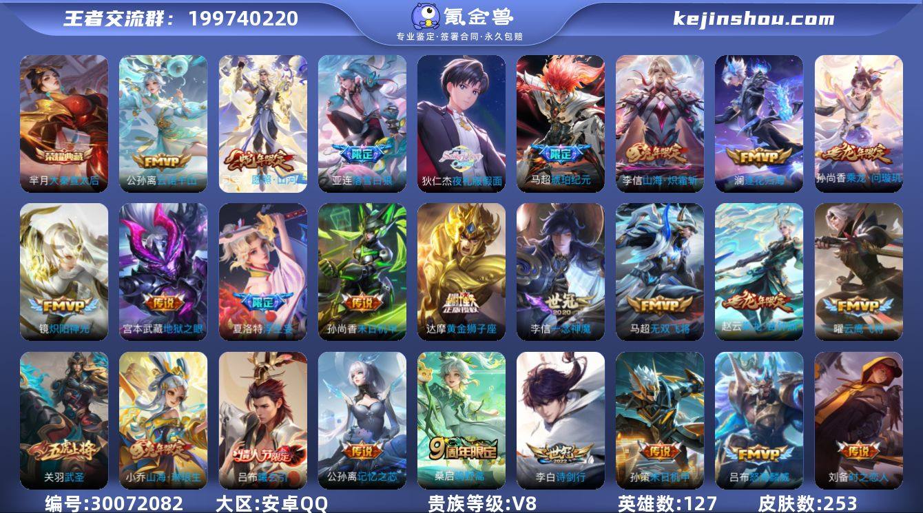 有一颗没兑换的水晶-安卓Q-V8-最强王者段位-127英雄-253皮肤-1典藏-0珍品无双-0无双-0珍品传说-36传说-88史诗 【英雄全皮】:孙权全皮,李信全皮,马超全皮,蒙恬全皮,夏洛特全皮,司空震全皮,戈娅全皮,影全皮 【荣耀典藏】:芈月大秦宣太后 【传说皮肤】:公孙离云诺千山,司空震愿照山河定,桑启鸣野蒿,亚连落雪白狼,吕布曦玄引,孙尚香乘龙问璇玑,赵云乘龙铭钟鼎,马超琥珀纪元,澜逐花归海,狄仁杰夜礼服假面,马可波罗妄想实况,张飞百相守梦,公孙离记忆之芯,夏洛特浮生妄,干将莫邪画中仙,花木兰燃星之曲,虞姬无限倾心,小乔山海琳琅生,李信山海炽霜斩,吕布怒海麟威,李白诗剑行,孙尚香音你闪耀,马超无双飞将,孙策末日机甲,周瑜音你心动,小乔音你心动,铠绛天战甲,镜炽阳神光,虞姬启明星使,关羽武圣,曜云鹰飞将,李信一念神魔,刘备时之恋人,达摩黄金狮子座,孙尚香末日机甲,宫本武藏地狱之眼 【限定皮肤】:暃埋骨钱,蒙犽顽岩魄,姜子牙天穹之誓,狄仁杰阴阳师,小乔山海琳琅生,赵云皇家上将,扁鹊奇幻香踪,芈月白晶晶,元歌无心,马可波罗山海玄木吟,马可波罗妄想实况,狄仁杰魔术师,项羽海滩派对,关羽武圣,花木兰默契交锋,花木兰燃星之曲,张飞百相守梦,李元芳云中旅人,虞姬启明星使,虞姬无限倾心,杨玉环遇见飞天,杨戬潮玩骑兵,干将莫邪画中仙,雅典娜黎明之约,鬼谷子五谷丰年,百里玄策原初追逐者,梦奇顽趣,沈梦溪匿光破解者,裴擒虎擒涛扼浪,云中君纤云弄巧,李信山海炽霜斩,上官婉儿神器万象笔,嫦娥拒霜思,嫦娥暖冬兔眠,西施玲珑珍味,鲁班大师探海日志,桑启海盐诗旅,夏洛特浮生妄,暃星界游侠,戈娅驭风魔法,艾琳流音漫舞,赵怀真鹤归松栖,司空震地狱燃心,阿古朵江河有灵,张良古海寻踪,狄仁杰夜礼服假面,蒙犽百解令,蒙恬荣光圣徽,高渐离燃音...