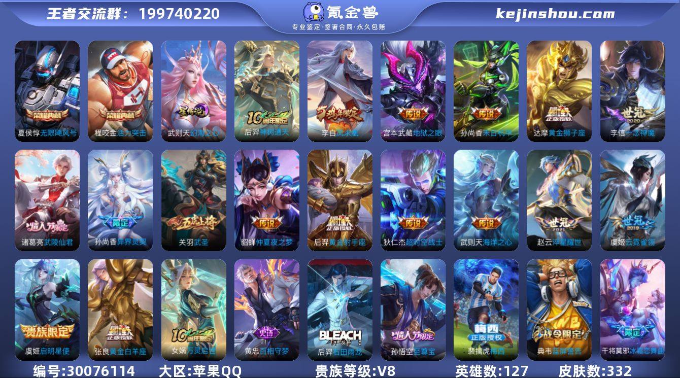 贵族等级:V8 典藏皮肤数:2 珍品无双皮肤数:0 无双皮肤数:0 珍品传说皮肤数:0 传说皮肤数:17 史诗皮肤数:119 皮肤数:332 英雄数:127 段位:星耀