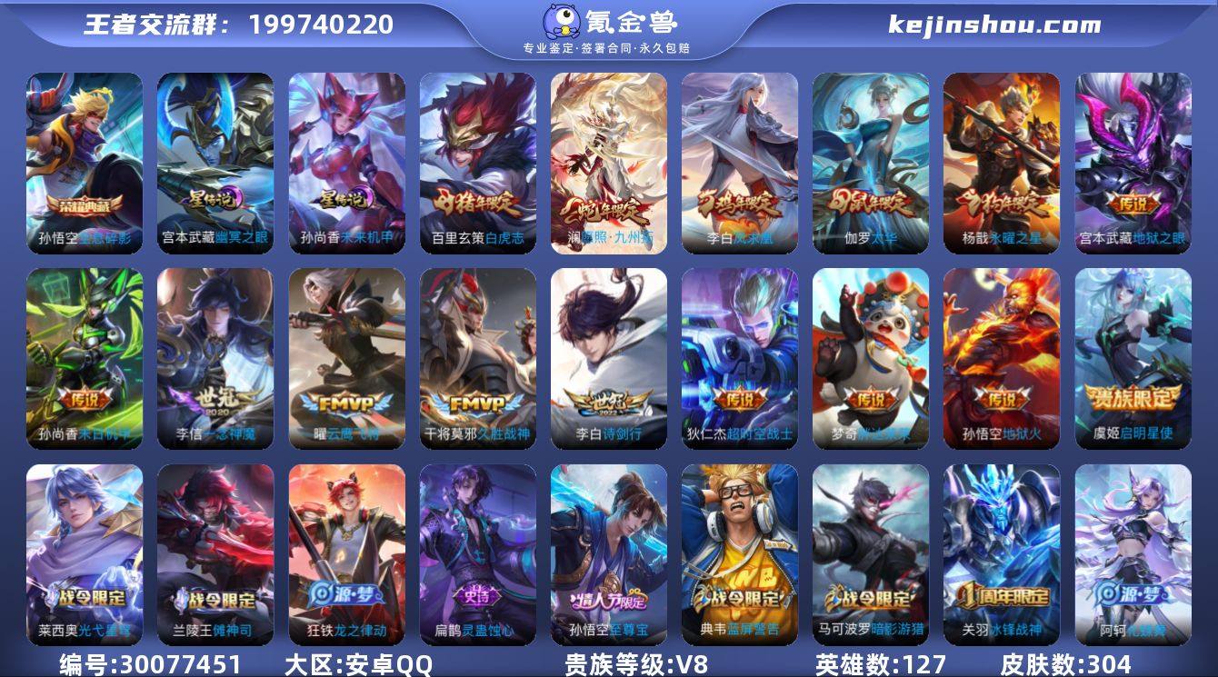 贵族等级:V8 典藏皮肤数:1 珍品无双皮肤数:0 无双皮肤数:0 珍品传说皮肤数:0 传说皮肤数:15 史诗皮肤数:80 皮肤数:304 英雄数:127 段位:无双王者 卖家说:荣耀水晶马上出自己换