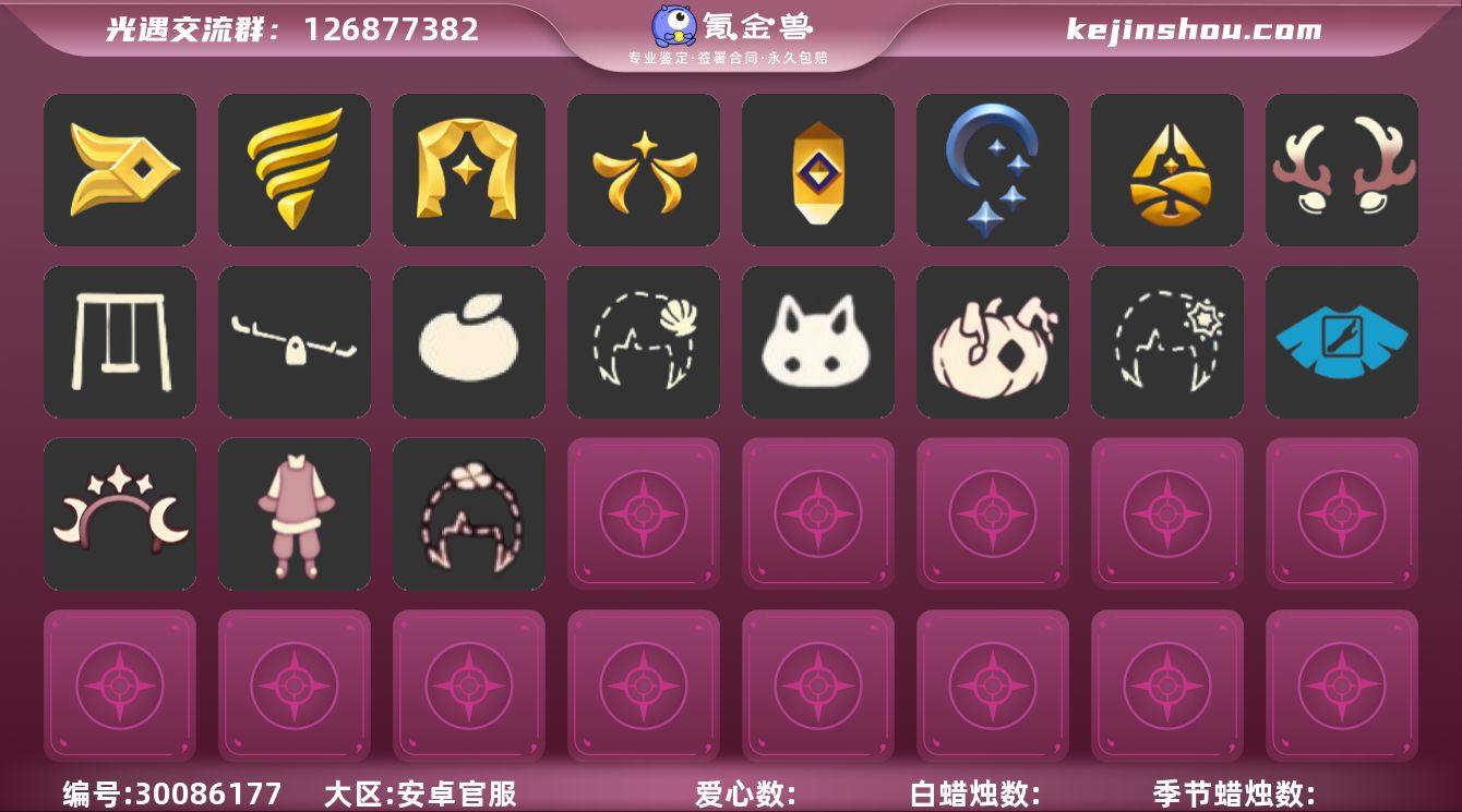 [17274173]安卓官服 邮箱账号 2珍稀物品 7毕业季 2毕业图 638蜡烛 【珍稀物品】白枭(帝企鹅发),透明蝶翼斗 【季节已毕业】梦想季,风行季,潜海季,表演季,破晓季,欧若拉季(欧若拉),追忆季 【完成地图】雨林,霞谷 【礼包】青衫落拓礼包,新年裤(瑞气服饰),蝴蝶结(大蝴蝶结),巫师(巫师帽),绊爱(绊爱斗篷)(绊爱礼包),橘子(大橘大利),雪花(雪花发夹),兔子(玉兔头饰)(玉兔发饰)(兔子发饰),四叶草(四叶草头饰),星月头饰(星月头冠),彩虹耳钉(彩虹耳饰),枯角(巫树犄角),鹿角(圣诞鹿角),创始人(创始人斗篷),围巾(小王子斗篷)(小王子围巾),星球斗(星球夹克),福娃(福娃礼包)(春之日礼包)(铜钱斗),海龟斗篷,蝙蝠套(蝙蝠斗篷)(南瓜头),瑞雪(瑞雪斗篷)(暖冬瑞雪),白绒金(白雪斗篷),吉他(音韵吉他)(白吉他),人声乐器(欧若拉之声),秋千(情人秋千),跷跷板(情人跷跷板),茶桌(花憩茶桌),大铁头 【裤子】蓝绿裤(高领舞服),武士裤,背带裤,搓澡巾 【面具】夜行毕业面具(棕熊面具),呼吸面具(潜水面具),黄眉企鹅面具,凤凰面具 【面饰】红耳机 【项链】围巾(肩带) 【发型】单侧绑发(单边小辫),留辫蘑菇头,虚荣,若笠(箬笠) 【头饰】平顶帽,蓝色音乐会(蓝色音乐符),羽毛发饰(多羽发饰) 【斗篷】冥龙斗篷,燕尾斗篷,遥鲲斗篷(双翼遥鲲斗),蟑螂斗(凤凰斗篷),绿芽,海洋斗 【配饰】鲲灯(追忆之书),雨伞,高音钢琴(白色高脚钢琴)