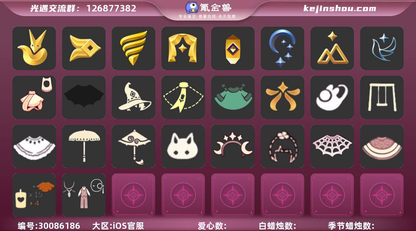 账号类型: 邮箱账号 季节已毕业: 梦想季,小王子季,潜海季,表演季,破晓季,欧若拉季,集结季,夜行季,追忆季,归巢季,九色鹿季,筑巢季 完成地图: 晨岛,云野,雨林,霞谷,暮土,禁阁 珍稀物品: 白枭,透明蝶翼斗,玫瑰花,彩虹围巾 礼包: 蝙蝠套,巫师,围巾,绊爱,鹿角,蜘蛛斗,秋千,茶桌,茶壶,白绒金,女巫裙,福娃,跷跷板,小船,吉他,雪花球,绒帽,橘子,贝壳,黄伞,红伞,兔子,南瓜,枯角,雪花,竖琴,水母,星月头饰,新年裤,四叶草,创始人,蛛网朋克 裤子: 武士裤,背带裤,搓澡巾,王子服,蓝绿裤,飞天裤,筑巢季·裤子 面具: 凤凰面具,贴花面具,呼吸面具,夜行毕业面具,黄眉企鹅面具 面饰: 红耳机,黑框眼镜 项链: 围巾 发型: 归巢毕业发型,若笠,虚荣,单侧绑发,小王子发型,留辫蘑菇头,飞天盘发 头饰: 行军锅头盔,蓝色音乐会,平顶帽 斗篷: 海洋斗,蟑螂斗,绿芽,粉红绒毛斗篷,遥鲲斗篷,黄色连帽披风,燕尾斗篷,冥龙斗篷 配饰: 雨伞,筑巢季·小手办,高音钢琴,相机,玫瑰花,鲲灯 亮点: 【优质装备】:表演季,白枭(帝企鹅发),武士裤,梦想季,小王子季(王子季),潜海季,破晓季,透明蝶翼斗,欧若拉季(欧若拉),归巢毕业发型(五塑彩羽发),行军锅头盔(六边锅帽子)(双耳锅帽子),筑巢季·小手办(光之子试衣),高音钢琴(白色高脚钢琴),集结季,玫瑰花,夜行季,追忆季,相机(季卡相机),彩虹围巾(五塑彩带斗),归巢季,九色鹿(九色鹿季),王子服(小王子套装),蓝绿裤(高领舞服),飞天裤(柔缎花边连)(九色鹿丝带裤),蟑螂斗(凤凰斗篷),围巾(肩带),筑巢季,蝙蝠套(蝙蝠斗篷)(南瓜头),绊爱(绊爱斗篷)(绊爱礼包),秋千(情人秋千),红耳机,围巾(小王子斗篷)(小王子围巾),鹿角(圣诞鹿角),蜘蛛斗(蛛丝斗篷)(蛛网斗篷),巫师(巫师帽),晨岛,云野,雨林,霞谷,墓土(暮土),禁阁,若笠(箬笠),筑巢季·裤子(设计师长袍),凤凰面具,贴花面具(丛林黑面具),呼吸面具(潜水面具),夜行毕业面具(棕熊面具),黄眉企...