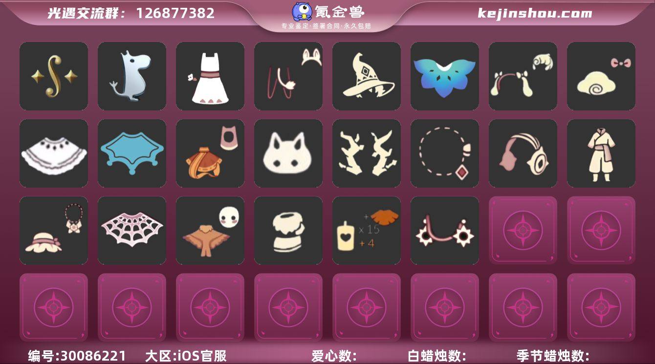 账号类型: 手机账号 季节已毕业: 潜海季,表演季,破晓季,欧若拉季,追忆季,归巢季,九色鹿季,二重奏季,姆明季,彩染季 完成地图: 晨岛,云野,雨林,霞谷,暮土,禁阁 珍稀物品: 白枭,透明蝶翼斗,彩虹围巾 礼包: 九色鹿角,绊爱,大铁头,秋千,吉他,奔跑发型,橘子,贝壳,兔子,南瓜,雪花,水母,星月头饰,彩虹耳机,四叶草,小提琴,爱心眼镜,新年耳钉,创始人,海蓝波浪发型,姆明饰品套装,献瑞折扇礼包,小狗周年发饰,青衫落拓礼包,线框斗篷礼包 裤子: 武士裤,背带裤,搓澡巾,击剑裤,妮妮裙子,蓝绿裤,飞天裤,青鸟尊贵蓬头裤子 面具: 呼吸面具,黄眉企鹅面具,辉光羚羊面具 面饰: 红耳机 项链: 围巾 发型: 归巢毕业发型,若笠,虚荣,单侧绑发,小王子发型,留辫蘑菇头,飞天盘发,海蓝波浪发型 头饰: 蓝色音乐会,平顶帽 斗篷: 海洋斗,绿芽,遥鲲斗篷,燕尾斗篷,冥龙斗篷,彩染围巾斗篷 配饰: 雨伞,高音钢琴,姆明抱枕,小红伞,二重奏挂画,鲲灯 亮点: 【优质装备】:表演季,白枭(帝企鹅发),武士裤,青鸟尊贵蓬头裤子(蓝色燕尾服),潜海季,破晓季,透明蝶翼斗,欧若拉季(欧若拉),归巢毕业发型(五塑彩羽发),高音钢琴(白色高脚钢琴),追忆季,妮妮裙子(妮妮长裙),姆明抱枕,小红伞(姆明红伞)(姆明大伞),彩虹围巾(五塑彩带斗),归巢季,九色鹿(九色鹿季),蓝绿裤(高领舞服),飞天裤(柔缎花边连)(九色鹿丝带裤),围巾(肩带),二重奏季,二重奏挂画(合奏挂画),姆明季,呼吸面具(潜水面具),黄眉企鹅面具,单侧绑发(单边小辫),小王子发型,留辫蘑菇头,遥鲲斗篷(双翼遥鲲斗),燕尾斗篷,冥龙斗篷,鲲灯(追忆之书),辉光羚羊面具,彩染季,飞天盘发(九色鹿丸子头),绊爱(绊爱斗篷)(绊爱礼包),秋千(情人秋千),小提琴(凯旋提琴),线框斗篷礼包(周年线框斗篷),红耳机,九色鹿角(神鹿祝福头饰)(神鹿祝福礼包),大铁头,吉他(音韵吉他)(白吉他),姆明饰品套装(姆明尾巴),彩虹耳机,晨岛,云野,雨林,霞谷,...