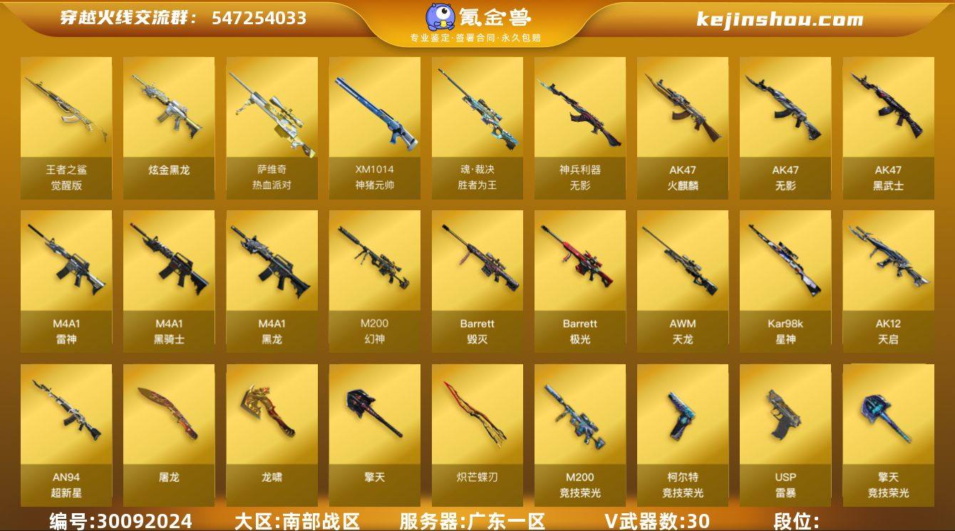 VIP等级:VIP6 V武器数:30 王者武器数:1 炫金武器数:1 王者之鲨-觉醒版 炫金黑龙 魂·裁决-胜者为王,萨维奇-热血派对,XM1014-神猪元帅,无影-神兵利器,AK47-火麒麟,AK47-无影,AK47-黑武士,M4A1-雷神,M4A1-黑骑士,M4A1-黑龙,M200-幻神,Barrett-毁灭,Barrett-极光,AWM-天龙,Kar98k-星神,AK12-天启,AN94-超新星,屠龙,龙啸,擎天,炽芒蝶刃,M200-竞技荣光,柯尔特-竞技荣光,USP-雷暴,擎天-竞技荣光,裁决,柯尔特-冠军之特,USP神工天巧,烈火-动感闪耀,天神-动感闪耀,屠龙-动感闪耀 电竞教官-云悠悠,王者影豹,星际战将,职业选手 M200-幻神音效卡,M4A1-黑骑士音效卡,M4A1-雷神音效卡,AK47-火麒麟音效卡 卖家说:喜欢的可以看看 带王者荣耀摇的荣耀