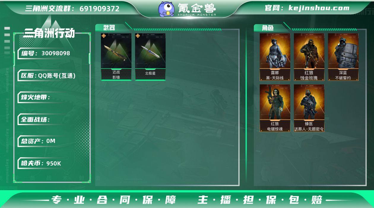 ABC9312/QQ区/可二次/【总资产:166M+哈夫币:95W+近战武器-影锋+近战武器-北极星+红狼蚀金玫瑰+露娜黑天际线+蜂医送葬人无题密令+红狼电锯惊魂+深蓝不破誓约】武器皮肤229;烽火60级:钻石Ⅱ,战场:军士长Ⅰ,【安全箱】基础安全箱;【特勤处等级】仓库LV.7,靶场LV.3,训练中心LV.6,收藏室LV.0,潜水中心LV.0;【捆绑包9】北极星捆绑包,鹅鸭杀捆绑包,蚀金玫瑰捆绑包,黑天际线捆绑包,电锯惊魂干员捆绑包,特斯拉线圈捆绑包,捞点薯条捆绑包,曙光捆绑包,蝮蛇捆绑包;【干员皮肤5】红狼蚀金玫瑰,露娜黑天际线,蜂医送葬人无题密令,红狼电锯惊魂,深蓝不破誓约;【近战皮肤】近战武器-影锋,近战武器-北极星,近战武器-黑鹰;【步枪皮肤】M4A1突击步枪-阿米娅,M4A1突击步枪-蚀金玫瑰,ASh-12战斗步枪-鹅鸭杀,AK-12突击步枪-夜鹰,AK-12突击步枪-特斯拉线圈,SCAR-H战斗步枪-启航,G3战斗步枪-骑士,CAR-15突击步枪-阿米娅,腾龙突击步枪-捞点薯条,K437突击步枪-北极星,KC17突击步枪-电锯惊魂,K437突击步枪-私人定制,AKM突击步枪-林中猎手,QBZ95-1突击步枪-曙光,QBZ95-1突击步枪-ACE,ASh-12战斗步枪-无极限,M16A4突击步枪-竞赛选手,AUG突击步枪-蝮蛇,AUG突击步枪-特勤执行,SG552突击步枪-深海恐惧,SCAR-H战斗步枪-国风,SCAR-H战斗步枪-猎鳄行动,SCAR-H战斗步枪-囚徒,G3战斗步枪-阿萨拉工艺,PTR-32突击步枪-OldHabits,ASVal突击步枪-尖端治疗,腾龙突击步枪-聚光灯,腾龙突击步枪-无垢,K437突击步枪-守护者;【冲锋枪皮肤】Vector冲锋枪-能天使-午夜邮差,UZI冲锋枪-特斯拉线圈,SR-3M紧凑突击步枪-特斯拉线圈,勇士冲锋枪-能天使-午夜邮差,QCQ171冲锋枪-北极星,QCQ171冲锋枪-鹅鸭杀,MP5冲锋枪-战术竞备,MP5冲锋枪-竞技风,P90冲锋枪-紧急戒备,Vector冲锋枪-阿萨拉文明,SR-3M紧凑突...