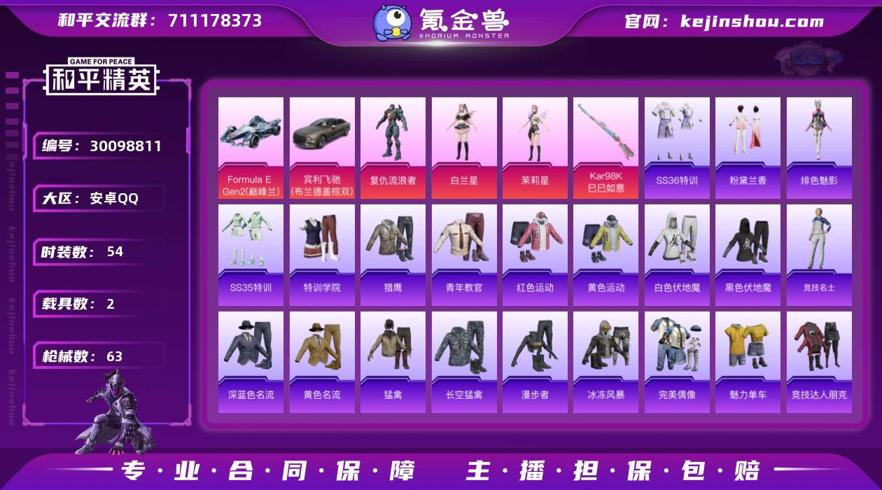 【2载具 1特效枪 3粉装 63枪皮 54套装】2印记/2.1万热力值/33级收藏家/角色-军刀雅典娜,角色-复仇流浪者,角色-白兰星,角色-茉莉星/1升级枪:Kar98K-巳巳如意/2载具:Formula E Gen2(巅峰兰),宾利飞驰(布罗德盖棕双色)/3飞行器:炫彩糖果飞行器,极意拳锋飞行器,登顶巅峰飞行器153197492x,编号:LYMOE66