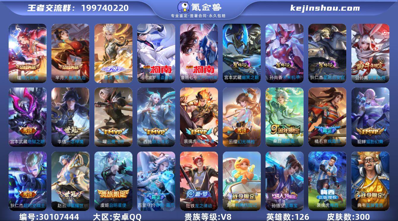 贵族等级:V8 典藏皮肤数:2 珍品无双皮肤数:0 无双皮肤数:1 珍品传说皮肤数:2 传说皮肤数:13 史诗皮肤数:89 皮肤数:300 英雄数:126 段位:无双王者 卖家说:梅西圣诞老人曜无双瑶芈月荣耀典藏怪德基德