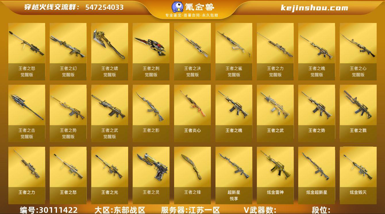 江西一区-121V-14王者武器数-2炫金武器数 【传说武器】:传说圣灵 【热门武器】:传说圣灵,QBZ03-金色蔷薇,Scar Light-白虎*2,HK417-朱雀,M200-幻神*2,M200-竞技荣光,荣耀世冠-火麒麟,荣耀世冠-雷神,白虎-电玩蓝兔,柯尔特-冠军之特,荣耀世冠-柯尔特*4,M4A1-黑骑士,汤姆逊-烈龙*7,RPK-盘龙*6,加特林-炼狱*3,斯泰尔-蝴蝶,羊驼玩偶,USP-雷暴,沙鹰-修罗*6,荣耀世冠-龙啸,金刚伞 【王者炫金武器】:王者玉锋,炫金千变,炫金超新星,王者之魄高爆手雷,王者之魄闪光弹*3 【音效卡】:M200-幻神音效卡,M4A1-雷神音效卡,M4A1-黑骑士音效卡,Barrett-毁灭音效卡,QBZ03-金色蔷薇音效卡,N9语音包,Barrett-碧霄极光音效卡 【皮肤】:幻神-AG-CFPLS17冠军,QBZ03-冠军之薇,裁决-胜者为王 皮肤,雷神-荣耀之魄,雷神-冠军之魄,雷神-R.LGD-CFPLS18冠军,雷神-荣耀世冠AG,火麒麟-冠军之心,火麒麟-平天大圣,毁灭-荣耀之怒,毁灭-SV-CFPLS16冠军,毁灭-英雄计划 皮肤,M4A1-千变-孔明皮肤,黑骑士-冠军之势,黑骑士-AG-S4冠军典藏,死神-机甲核心皮肤,战神-紫绶金章皮肤,极光-能量核心,炼狱-星空,修罗-星空,屠龙-荣耀之锋,屠龙-荣耀世冠AG*3,龙啸-青青莓果 皮肤,擎天-秘银 【角色】:樱,电竞教官-云悠悠,王者复仇,王者凌霄,王者-魅影,王者沙漠玫瑰,云海玲珑,暗夜-X,初恋灵狐,芳心审判者,嘉年华灵狐,娟娟,零-水下丽影,灵狐者-职业经理,麻雀,潘多拉-X,潘多拉-甜心教官,铁骑荣耀,职业选手 【人偶武器】:天龙-曼陀罗,斯泰尔-蝴蝶,AWM-灵狐-15周年嘉年华,COP-旗袍,迷你波特博士*6,迷你火种*4,迷你生化手雷,生化手雷-机甲核心,深渊终结者手雷,迷你超能女侍,灵狐娃娃手雷 【暴走生化】:异变清道夫 【挑战大师】:神圣爆裂者III,冰龙粉碎者-白马银枪,VEPR-12-金魔,...