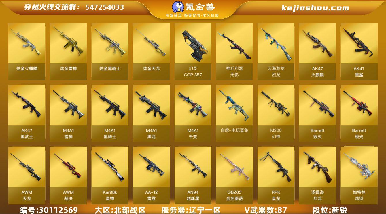 辽宁一区-90V-2王者-4炫金 【热门武器】:QBZ03-金色蔷薇,M200-幻神,M200-竞技荣光,白虎-电玩蓝兔,Kar98K-星神,炼狱-迷你小钢,M4A1-黑骑士*3,汤姆逊-烈龙*6,RPK-盘龙*6,加特林-炼狱*2,斯泰尔-蝴蝶,COP 357-幻灵,沙鹰-修罗*5,黄金猫猫手套-白鲨 【王者炫金武器】:炫金火麒麟,炫金骑士,炫金雷神,炫金天龙 【音效卡】:M4A1-雷神音效卡,M4A1-黑骑士音效卡,Barrett-毁灭音效卡,Barrett-极光音效卡,70KG语音包,火线妹语音包 【皮肤】:M200-幻神-黄忠皮肤,幻神-青鹤,星神-枪娘默 皮肤,雷神-耀金皮肤,雷神-冠军之魄,雷神-机甲刑天皮肤,雷神-维纳斯皮肤,火麒麟-雷神,火麒麟-冠军之心,火麒麟-百城,火麒麟-心动糖果,毁灭耀金皮肤,M4A1-千变-孔明皮肤,黑龙-能量核心,黑骑士-冠军之势,战神-粉色甜心皮肤*2,战神-紫绶金章皮肤,战神-流金岁月皮肤,极光-能量核心,修罗-冠军之魂,擎天-冠军之击 【角色】:雨棠,关小雨,隼,王者春,乔伊教练,云海玲珑,暗夜-X,电竞少女,芳心审判者,虎妞,嘉年华灵狐,娟娟,灵狐-花神,灵狐者-X,灵狐者-职业经理,龙儿,曼陀罗-礼服,女主播,潘多拉-X,潘多拉-甜心教官,潜龙队-X,斯沃特-X,蜀雪,铁骑荣耀,新娜塔莎,夜玫瑰-幻能朋克,樱-战斗天使,职业选手 【人偶武器】:火麒麟-灵狐,炼狱-迷你小钢,斯泰尔-蝴蝶,斯泰尔-枪娘暗刃,AWM-灵狐-15周年嘉年华,黄金迷你深渊冰龙,迷你牛魔王,迷你生化手雷*2,生化手雷-机甲核心,闪光弹-小乔,迷你超能女侍,AK12-夜玫瑰 【暴走生化】:双面神,超级对讲机 【挑战大师】:神圣爆裂者III,AK47-冰龙粉碎者,冰龙粉碎者-白马银枪,激光毁灭者III-白马银枪,VEPR-12-金魔,激光毁灭者III 【英雄级武器】:M4A1-千变,AK47-火麒麟*2,M4A1-黑龙*3,M4A1-雷神,M4A1-黑骑士*3,AK47-黑武士,AN9...