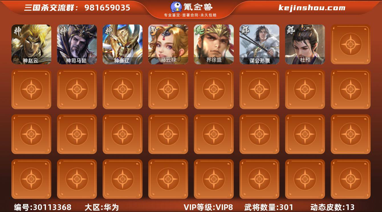 国杀华为服,动皮神司马懿,杜预,界徐盛,谋公孙瓒。 史诗武将如图。二等骠骑将军v8,攒了近五千将魂可以换关索或者半价,绝对安全