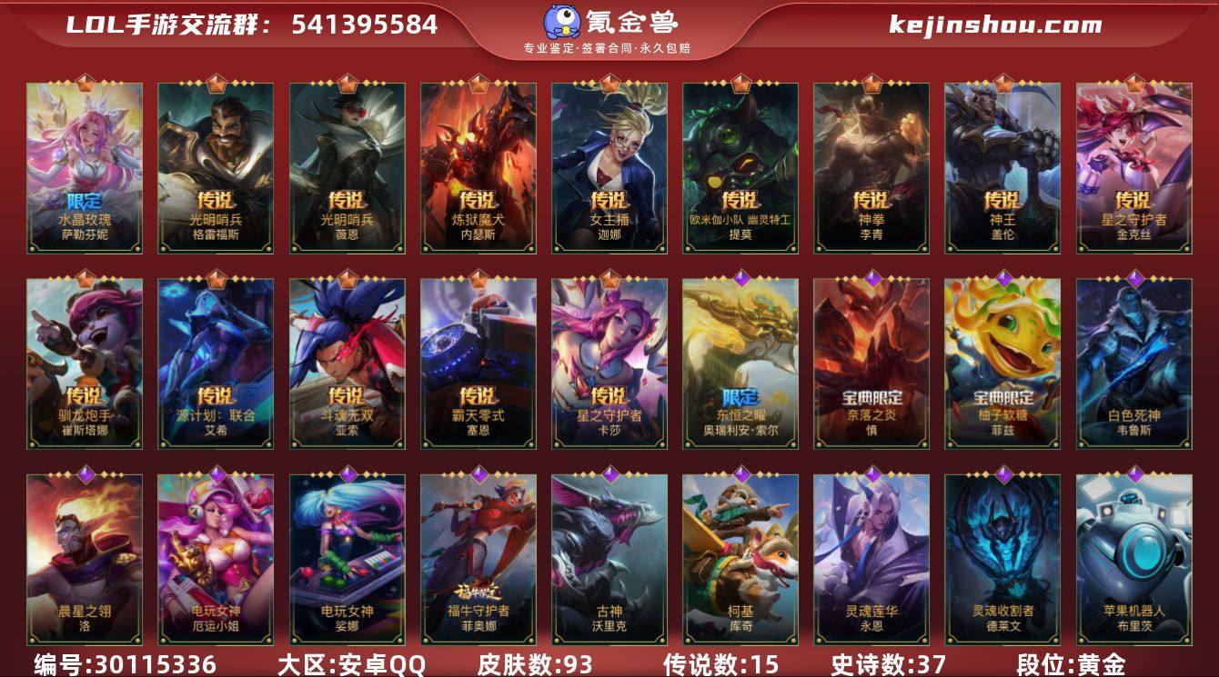 皮肤数:93 典藏皮肤数量:0 神话皮肤数量:0 传说皮肤数量:15 史诗皮肤数量:37 段位:黄金