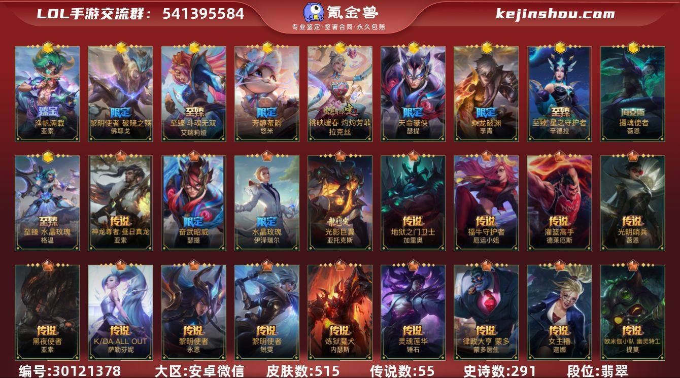 皮肤数:515 典藏皮肤数量:0 神话皮肤数量:14 传说皮肤数量:55 史诗皮肤数量:291 段位:翡翠