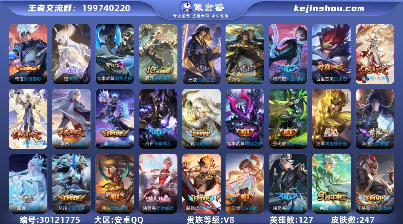 贵族等级:V8 典藏皮肤数:1 珍品无双皮肤数:0 无双皮肤数:1 珍品传说皮肤数:0 传说皮肤数:28 史诗皮肤数:69 皮肤数:247 英雄数:127 段位:无双王者 卖家说:v8,玄策澜韩信都是1.1w金标,具体看图