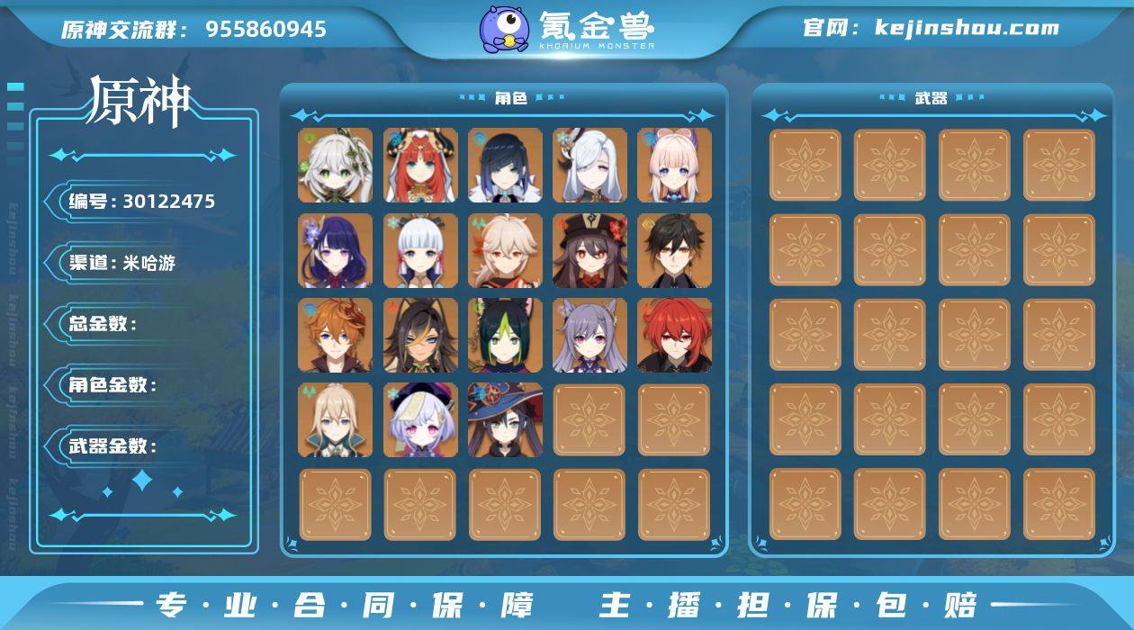 冒险等级:60 总黄数:51 5星角色数:28 5星武器数:11 原石数量:4 纠缠之源数量:0 4命琴,1命玛薇卡,1命阿蕾奇诺,1命夜兰,1命提纳里,1命刻晴,1命迪卢克,1命七七,1命莫娜,0命瓦雷莎,0命梦见月瑞希,0命希诺宁,0命希格雯,0命闲云,0命娜维娅,0命芙宁娜,0命莱欧斯利,0命那维莱特,0命赛诺,0命魈,0命雷电将军,0命宵宫,0命神里绫华,0命枫原万叶,0命胡桃,0命钟离,0命达达利亚,0命迪希雅 6命班尼特,6命久岐忍,6命香菱,6命行秋,6命夏洛蒂,6命夏沃蕾,6命芭芭拉,6命北斗,6命重云,6命菲谢尔,6命九条裟罗,6命坎蒂丝,6命雷泽,6命罗莎莉亚,6命莱依拉,6命诺艾尔,6命五郎,6命烟绯,5命迪奥娜,5命辛焱,5命云堇,5命早柚,4命多莉,4命柯莱,4命凝光,4命托马,3命嘉明,3命卡齐娜,3命伊安珊,3命丽莎,3命鹿野院平藏,2命安柏,2命米卡,2命砂糖,1命琳妮特,1命蓝砚,1命赛索斯,1命珐露珊,1命凯亚,0命菲米尼,0命欧洛伦,0命伊法,0命卡维,0命瑶瑶 精1裁断,精1图莱杜拉的回忆,精1圣显之钥,精1赤沙之杖,精1若水,精1波乱月白经津,精1和璞鸢,精1狼的末路,精1天空之翼 100%侦察骑士,古恩希尔德的传承,花时来信,极夜真梦,宿雪桃红,岁夜欢哗,星与月之约,雨化竹身,殷红终夜,叶隐芳名,致教会自由人 卖家说:角色大保底,有皮肤