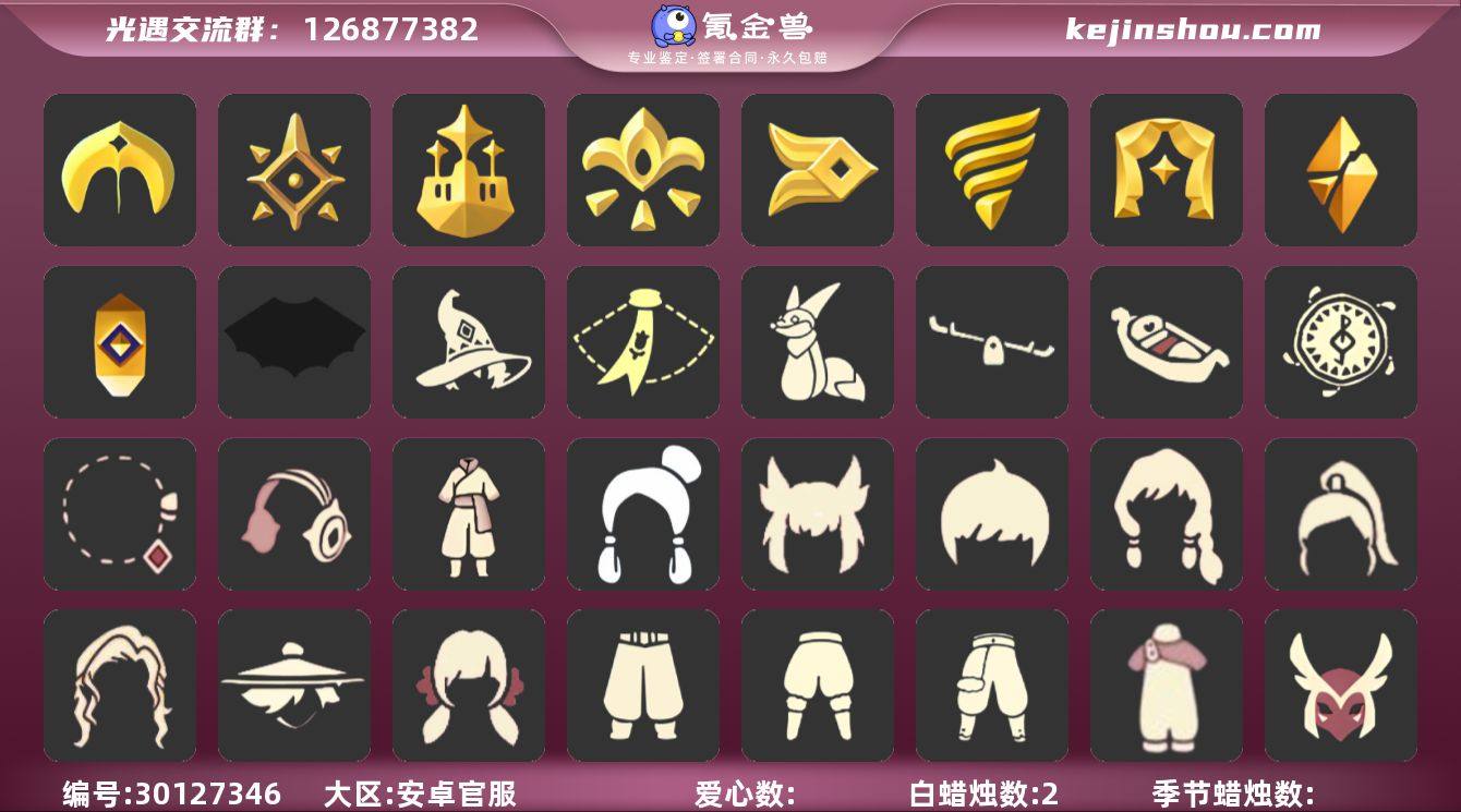 账号类型: 手机账号 季节已毕业: 预言季,梦想季,小王子季,风行季,潜海季,表演季,破晓季,欧若拉季,集结季,夜行季,追忆季,拾光季,归巢季,九色鹿季,筑巢季,二重奏季,姆明季,彩染季,青鸟季,双星季,迁徙季 完成地图: 晨岛,云野,雨林,霞谷,暮土,禁阁 珍稀物品: 阿努比斯(狗头),白枭,透明蝶翼斗,玫瑰花,彩虹围巾 礼包: 蝙蝠套,巫师,围巾,九色鹿角,绊爱,鹿角,蜘蛛斗,秋千,橘子,贝壳,兔子,枯角,雪花,水母,星月头饰,彩虹耳钉,四叶草,新年耳钉,满月耳坠 裤子: 武士裤,背带裤,搓澡巾,击剑裤,妮妮裙子,王子服,蓝绿裤,飞天裤,筑巢季·裤子,青鸟尊贵蓬头裤子 面具: 阿努比斯,凤凰面具,贴花面具,呼吸面具,夜行毕业面具,黄眉企鹅面具,辉光羚羊面具 面饰: 红耳机,黑框眼镜,青鸟毕业面饰 项链: 围巾 发型: 归巢毕业发型,若笠,虚荣,单侧绑发,小王子发型,留辫蘑菇头,飞天盘发 头饰: 行军锅头盔,羽毛发饰,牛仔帽,蓝色音乐会,平顶帽 斗篷: 海洋斗,蟑螂斗,绿芽,粉红绒毛斗篷,遥鲲斗篷,黄色连帽披风,燕尾斗篷,冥龙斗篷,彩染围巾斗篷,青鸟毕业斗篷 配饰: 雨伞,筑巢季·小手办,高音钢琴,姆明抱枕,小红伞,相机,玫瑰花,二重奏挂画,圆鼓,鲲灯 亮点: 【优质装备】:预言季,阿努比斯(狗头),表演季,白枭(帝企鹅发),武士裤,梦想季,小王子季(王子季),风行季,潜海季,破晓季,透明蝶翼斗,欧若拉季(欧若拉),归巢毕业发型(五塑彩羽发),行军锅头盔(六边锅帽子)(双耳锅帽子),羽毛发饰(多羽发饰),筑巢季·小手办(光之子试衣),高音钢琴(白色高脚钢琴),集结季,玫瑰花,夜行季,追忆季,妮妮裙子(妮妮长裙),牛仔帽(西部帽),姆明抱枕,小红伞(姆明红伞)(姆明大伞),相机(季卡相机),拾光季,彩虹围巾(五塑彩带斗),归巢季,九色鹿(九色鹿季),王子服(小王子套装),蓝绿裤(高领舞服),飞天裤(柔缎花边连)(九色鹿丝带裤),蟑螂斗(凤凰斗篷),围巾(肩带),筑巢季,蝙蝠套(蝙蝠斗篷)(南瓜...