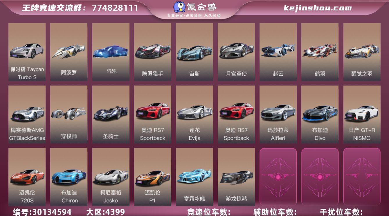 保时捷 Taycan Turbo S,阿波罗,混沌,月宫圣使,隐匿猎手,宙斯 赵云,鹤羽,醒觉之羽,梅赛德斯-AMG GT Black Series,穿梭师,圣骑士,神剑号,莲花 Evija,奥迪 RS7 Sportback,玛莎拉蒂 Alfieri,布加迪 Divo,日产 GT-R NISMO,迈凯伦 720S,布加迪 Chiron,柯尼塞格 Jesko,迈凯伦 P1 寒霜冰魄 游龙惊鸿 卖家说:诚信出号,黑金车跟那些免费的基本都有,有看上的,可以讲价