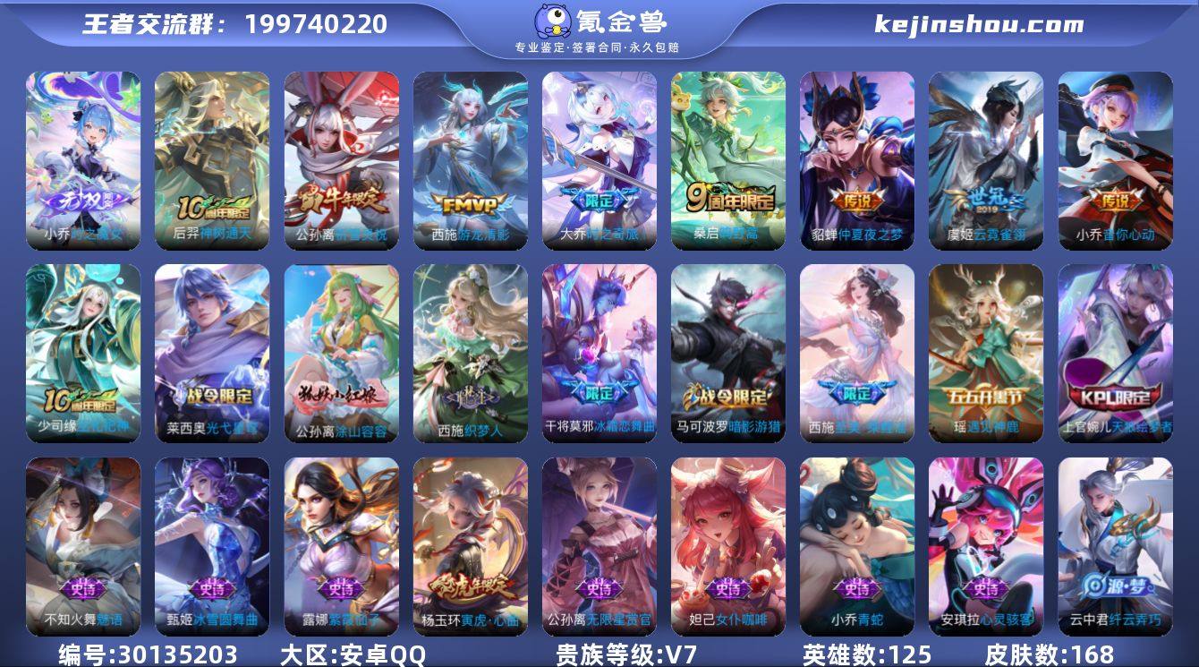 贵族等级:V7 典藏皮肤数:0 珍品无双皮肤数:0 无双皮肤数:1 珍品传说皮肤数:0 传说皮肤数:8 史诗皮肤数:52 皮肤数:168 英雄数:125 段位:荣耀王者